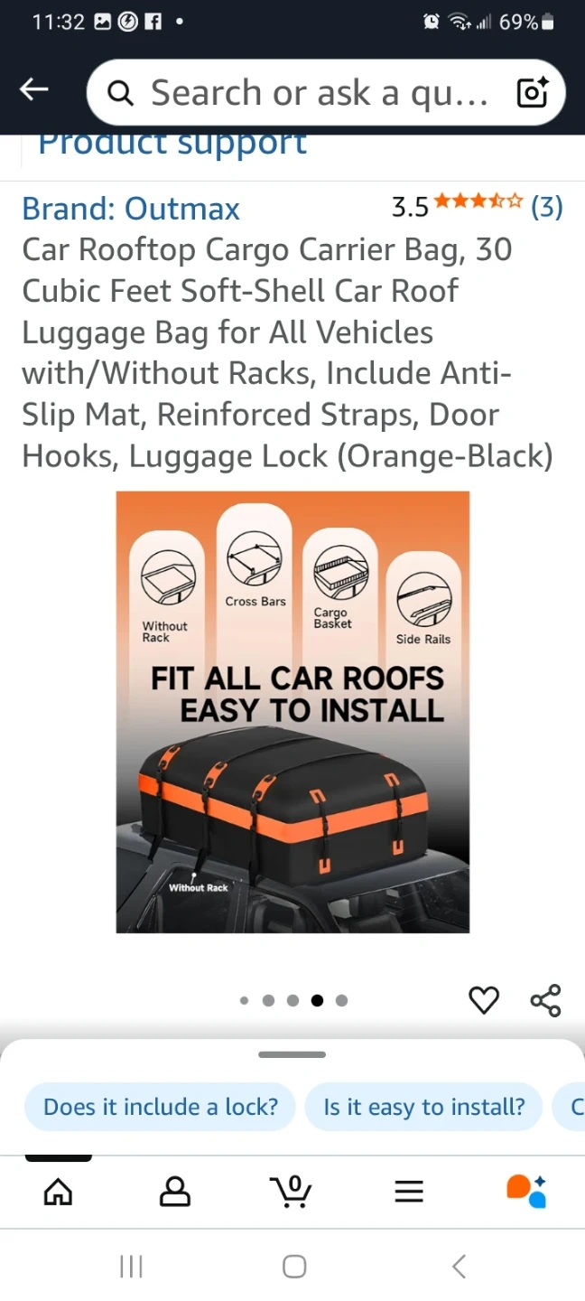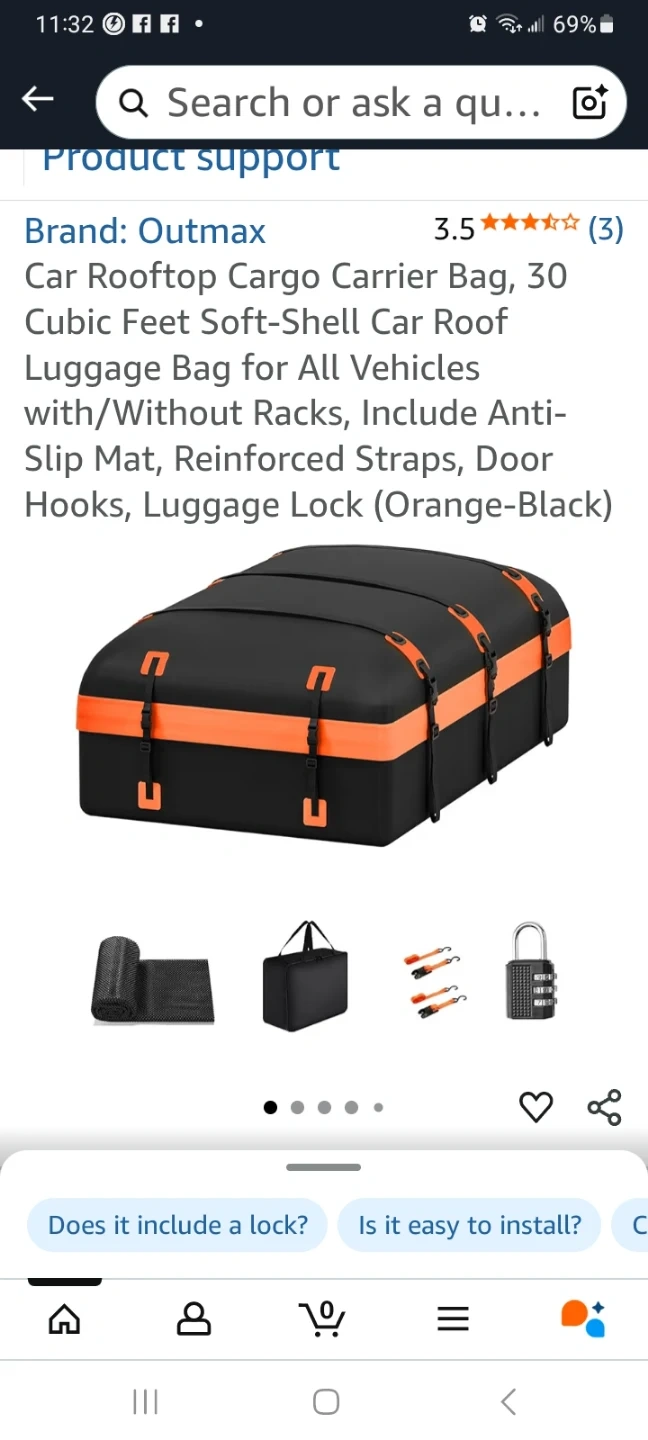 Selling an Outmax car rooftop cargo carrier bag! It's a 30 cubic feet soft-shell carrier bag suitable for all vehicles with or without racks. Includes an anti-slip mat, reinforced straps, door hooks, and a luggage lock (orange-black)