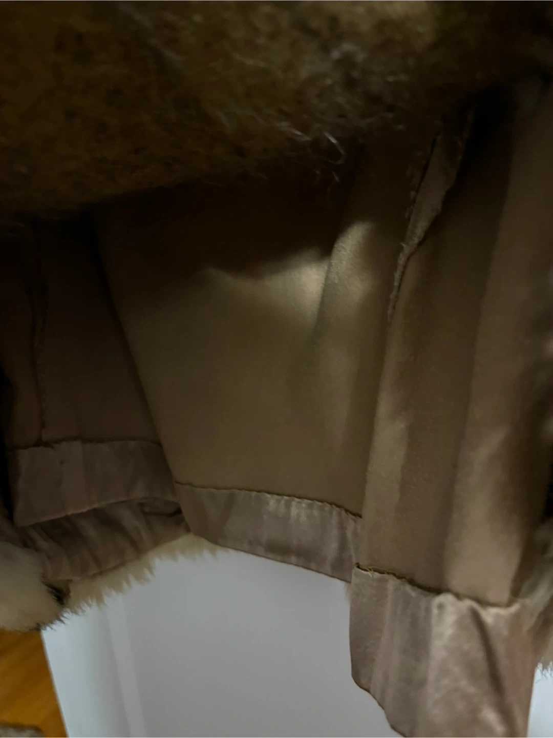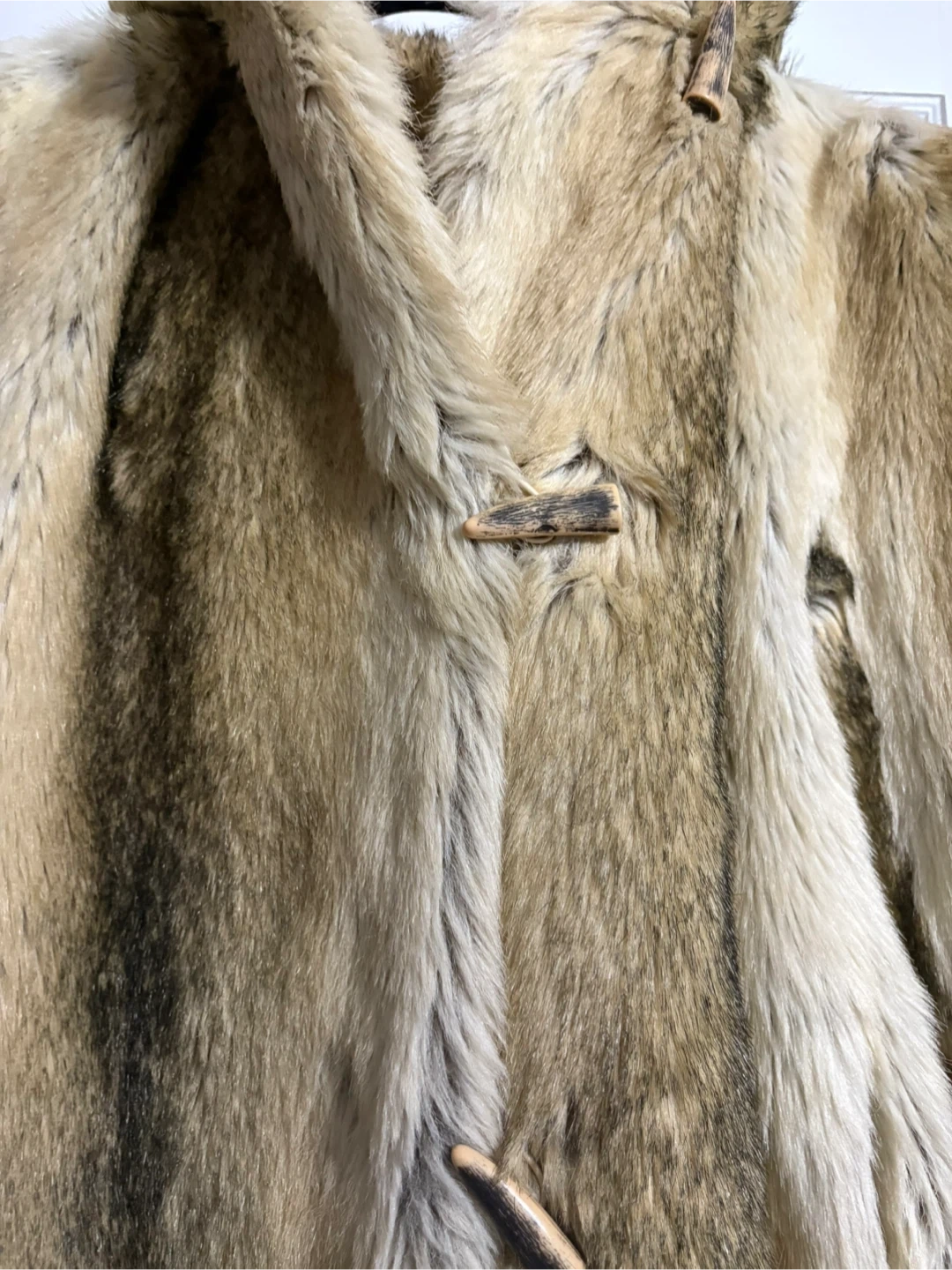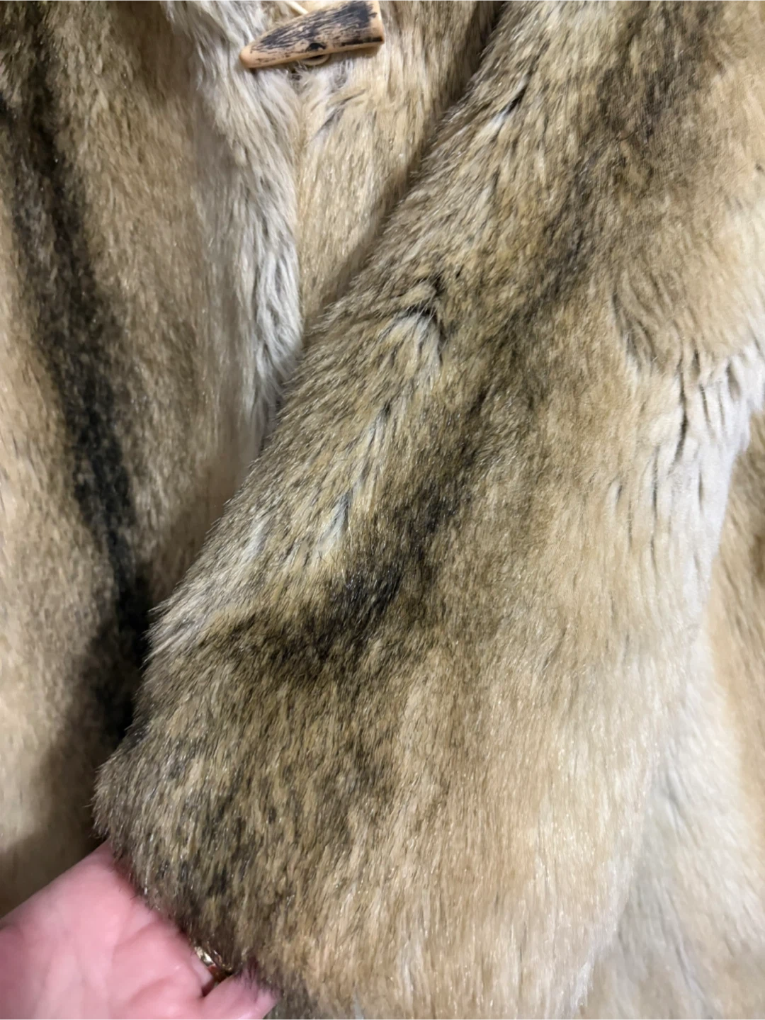 Cozy faux fur coat with a hood! It has a unique toggle closure and a soft lining to keep you warm on chilly days