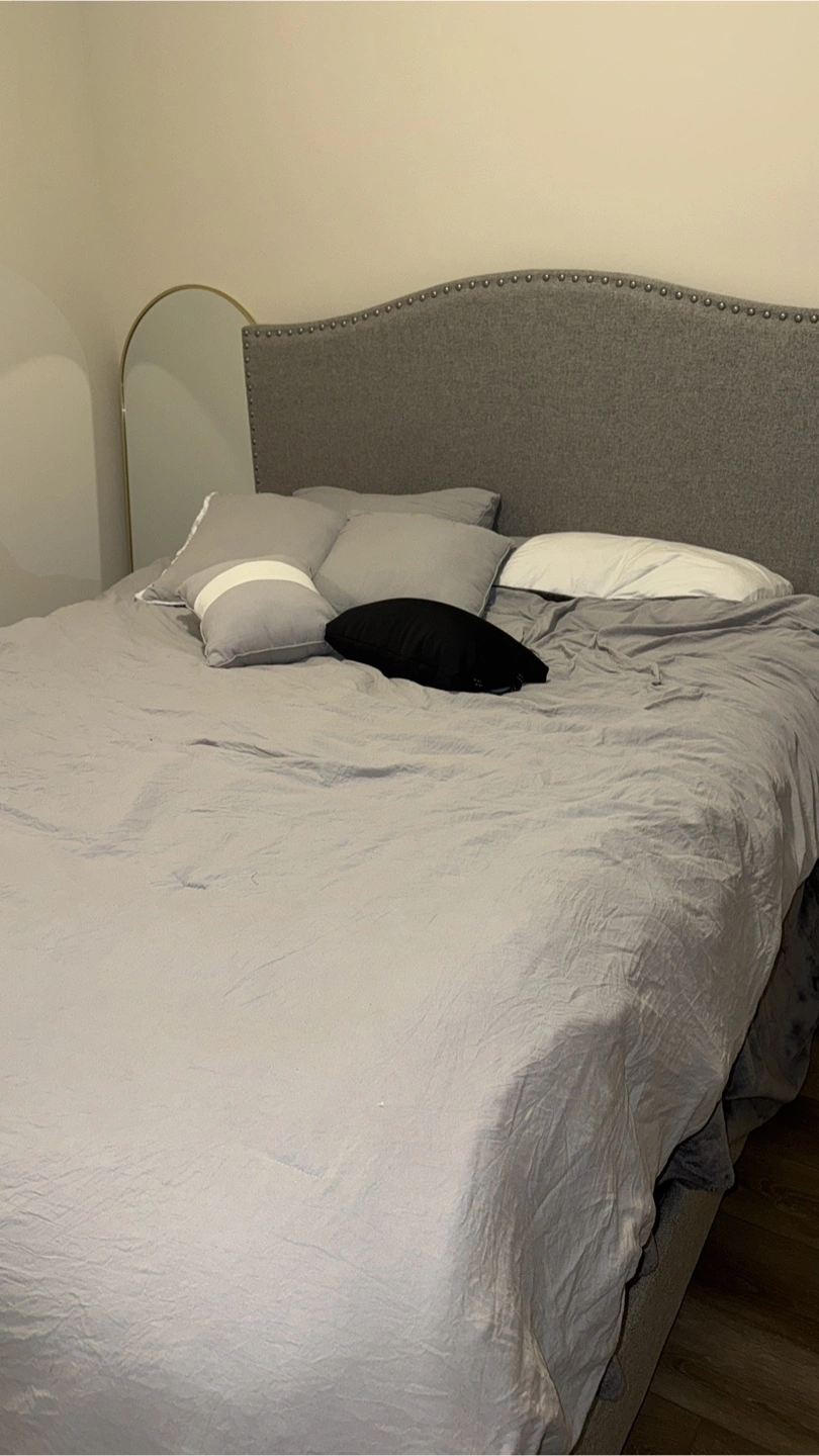 Selling a bed with a grey headboard. It features a simple, elegant design that would look great in any bedroom. The bed appears to be in good condition and ready for a new home!