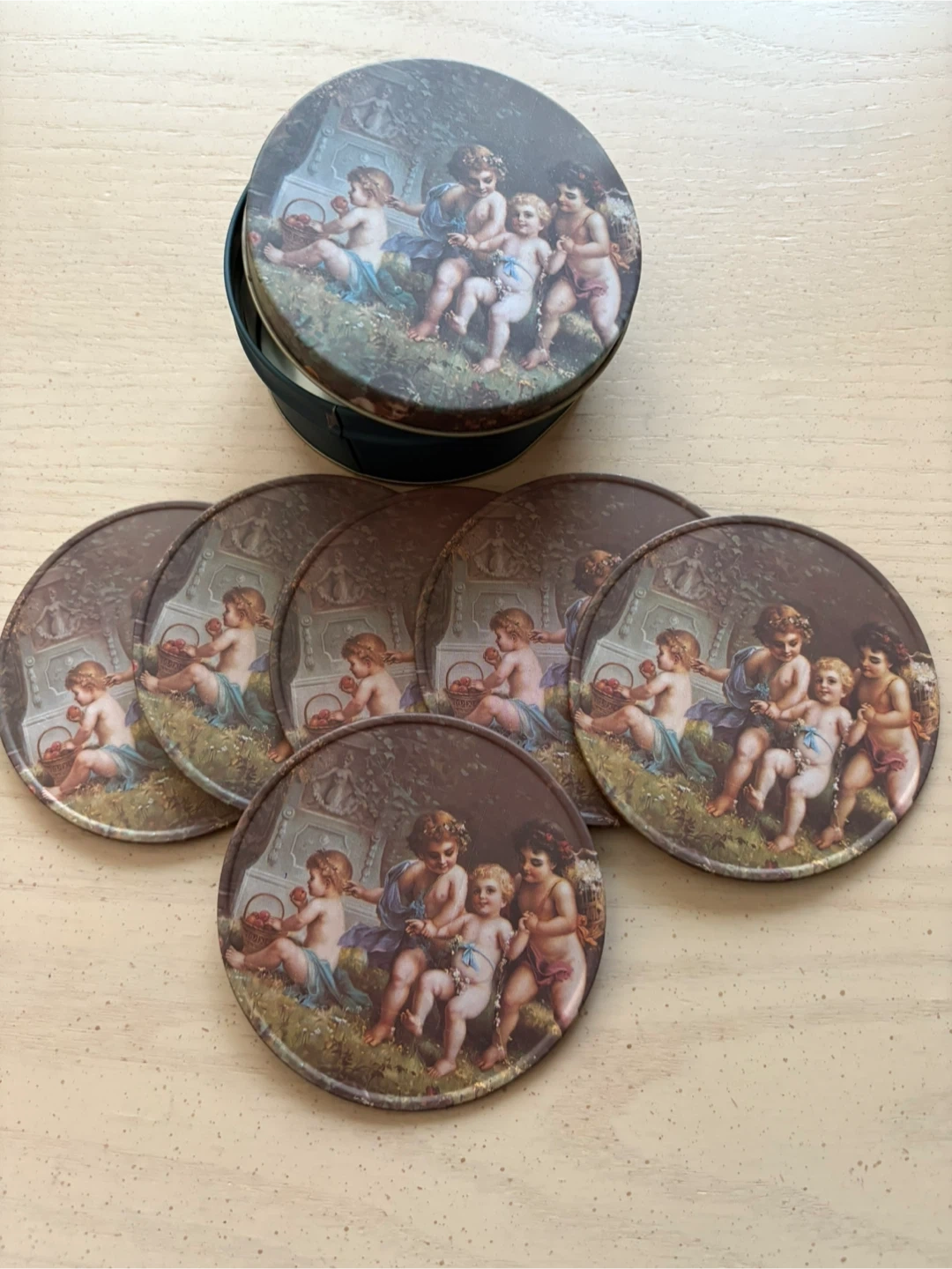 Vintage Cherub Coasters w/ Cork Bottoms & Tin