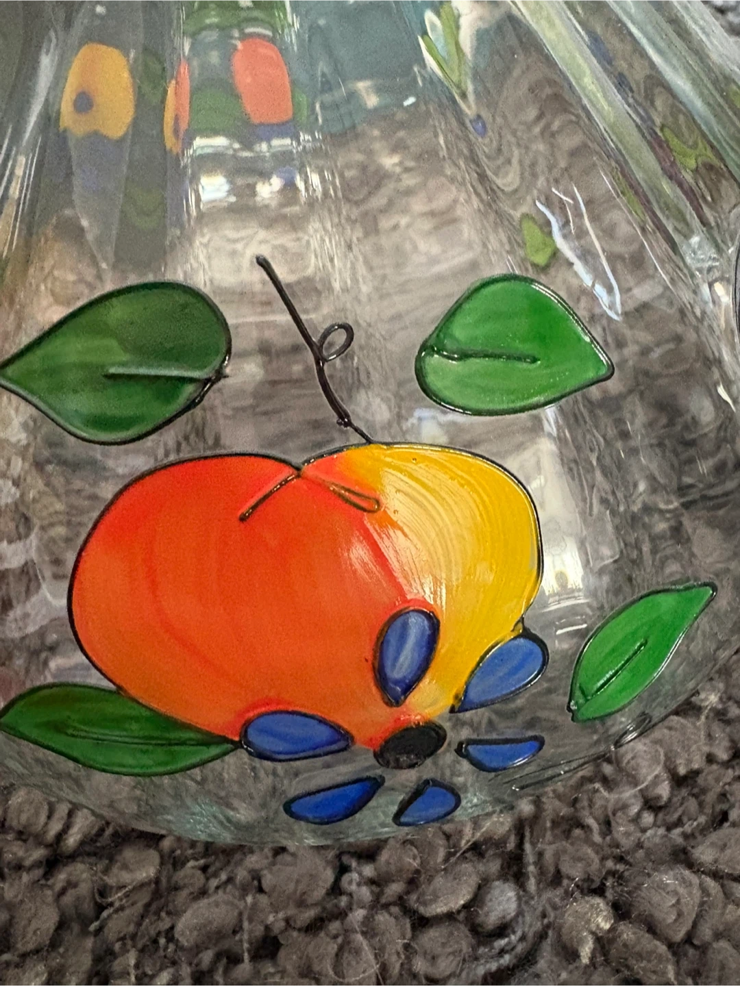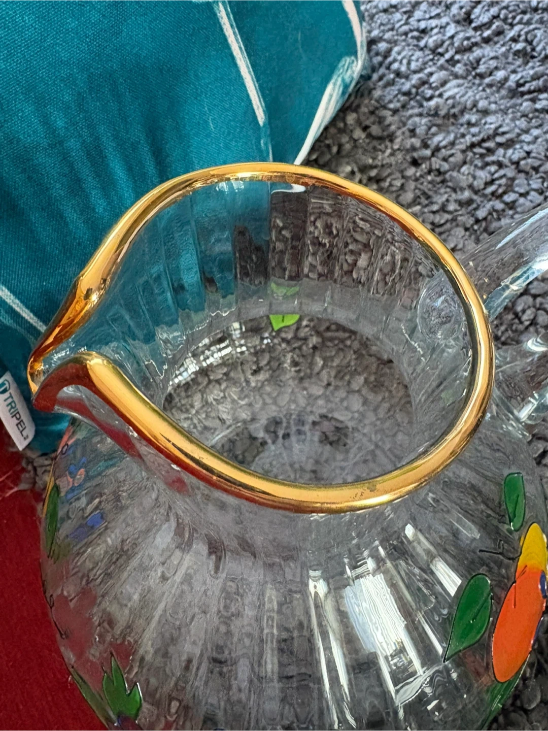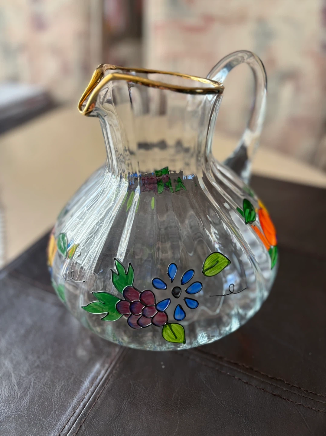 Selling a lovely hand-painted glass pitcher. It features a clear glass body with colourful floral designs and a gold-trimmed spout. Perfect for serving your favourite drinks!
