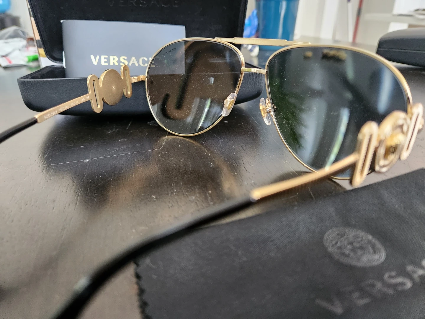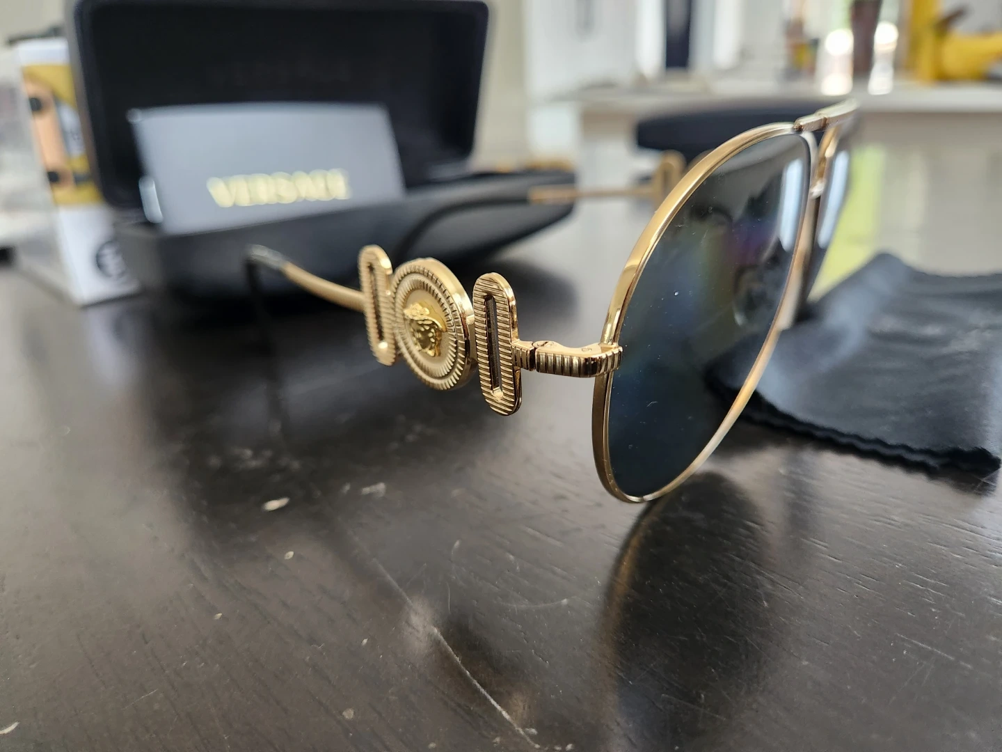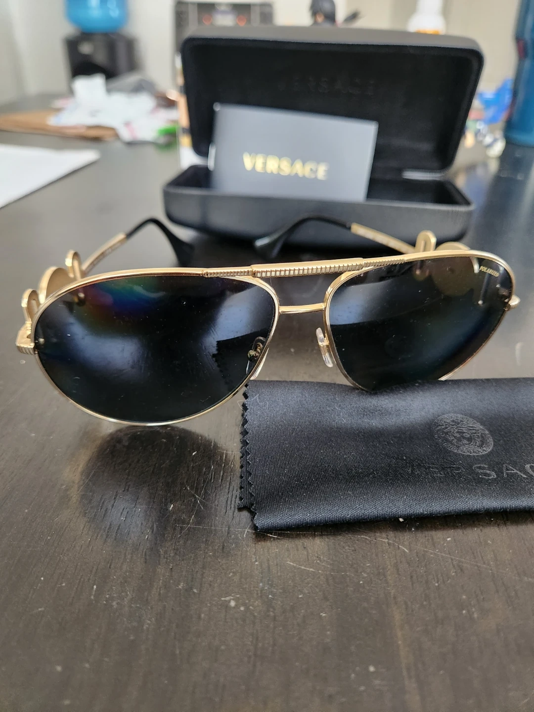 Selling a pair of Versace aviator sunglasses with a gold frame. They are in great condition and come with the original case and cleaning cloth!