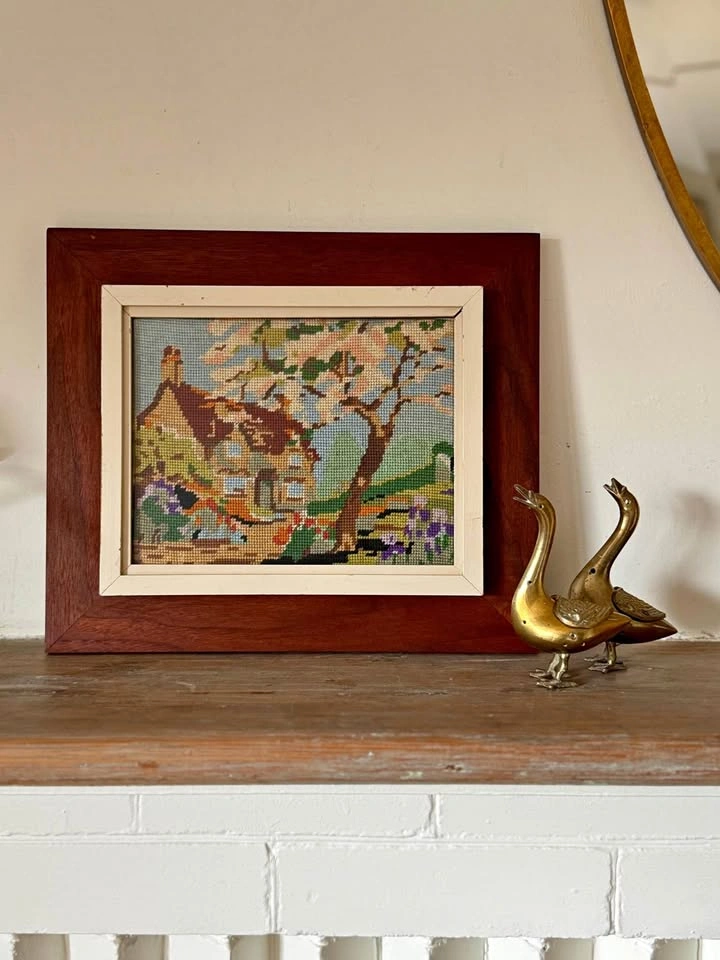 Vintage Art, Needlepoint, Cottagecore, Tapestry, Framed Art, Cross Stitch, Farmhouse Decor, Folk Art, Country Cottage, Home Decor, Wall Art, Antique, tapestry, cross stitch embroidery petit point