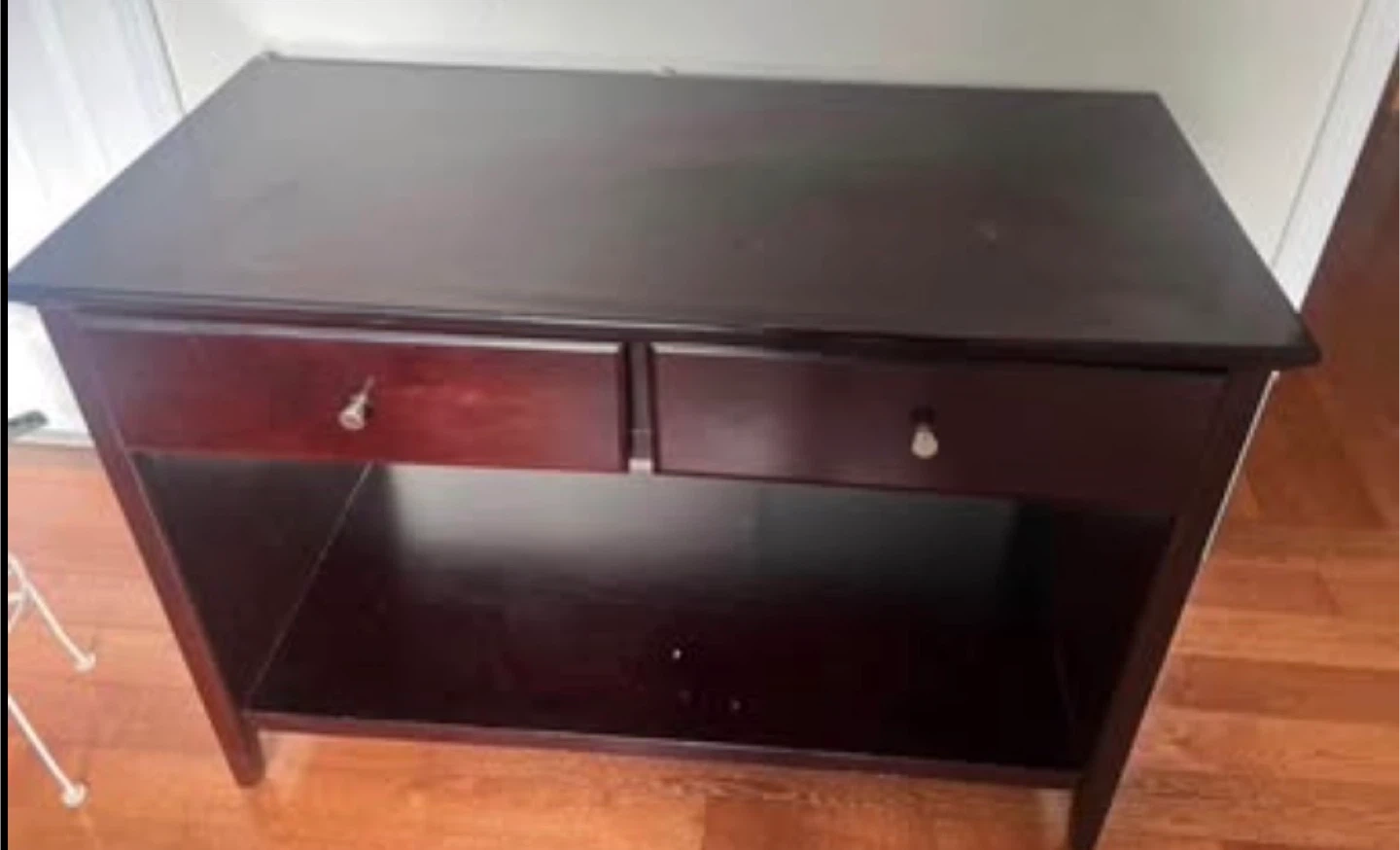 Here's a dark brown study table/ work desk that would look great in study room or living room! It features two drawers for storage and an open shelf below. It's in good condition and ready for a new home.