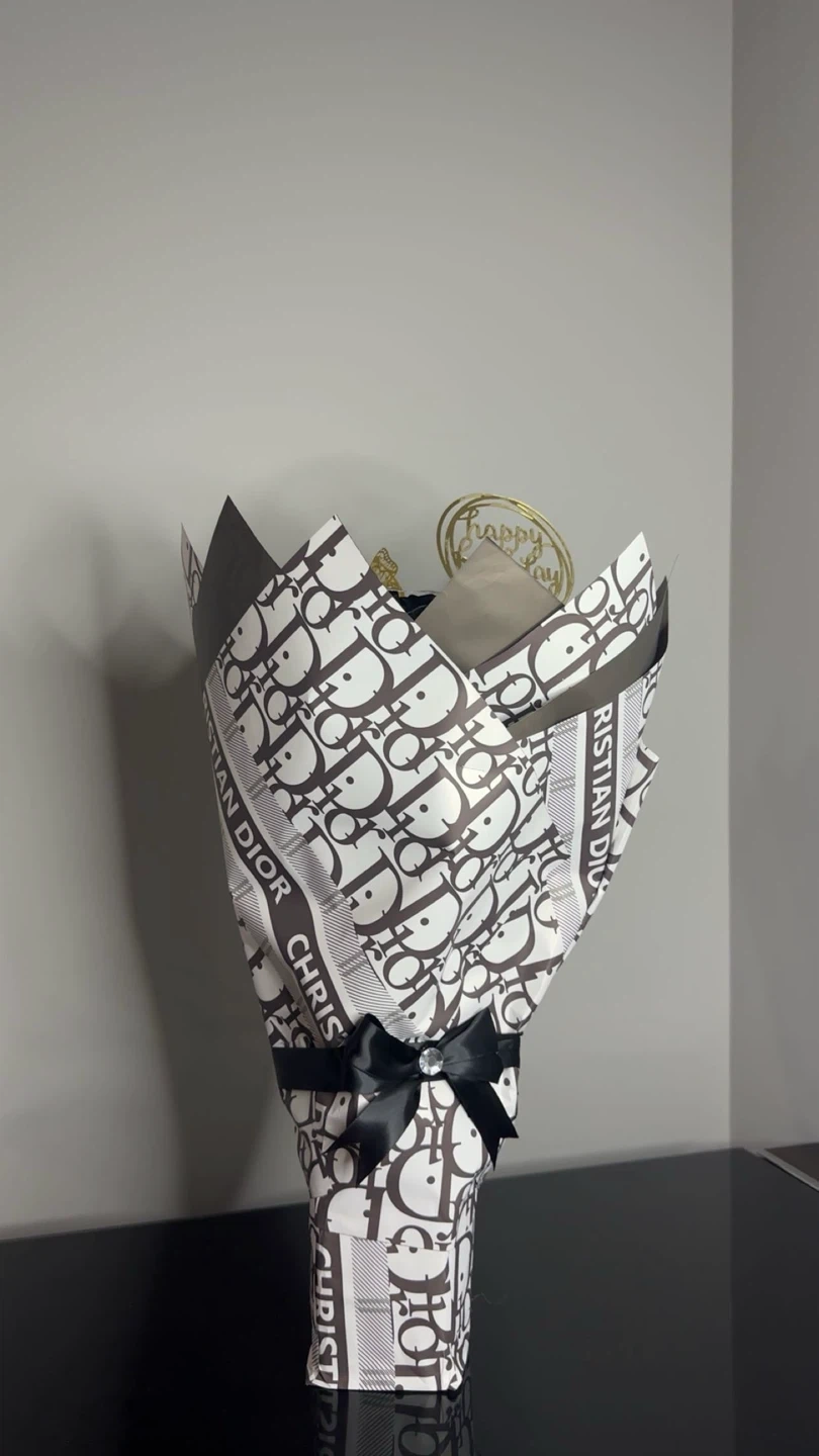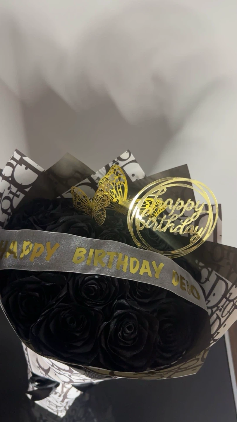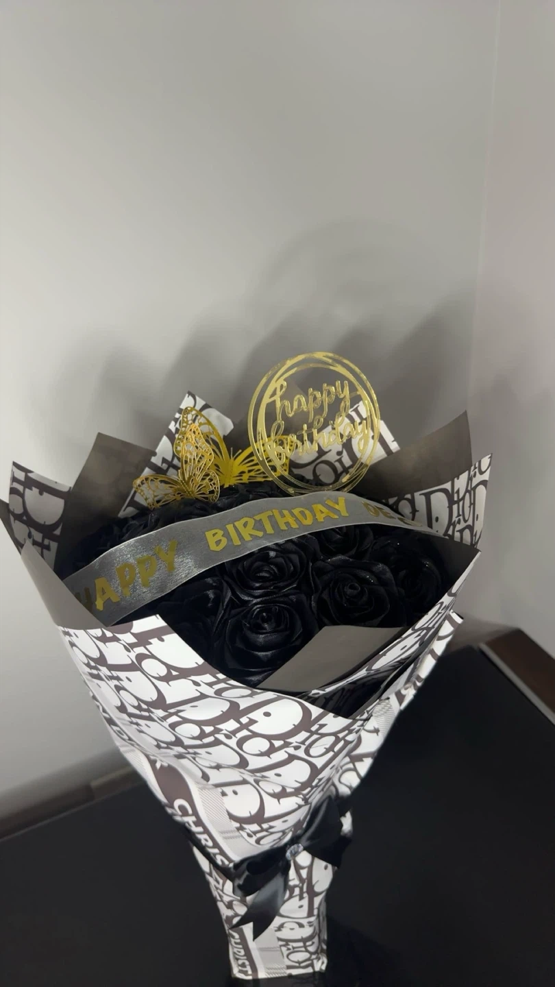 A beautiful Christian Dior wrapped bouquet of black roses with a 'Happy Birthday' ribbon and topper