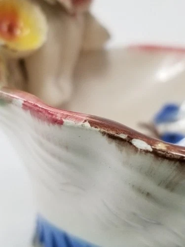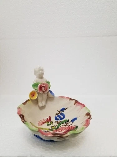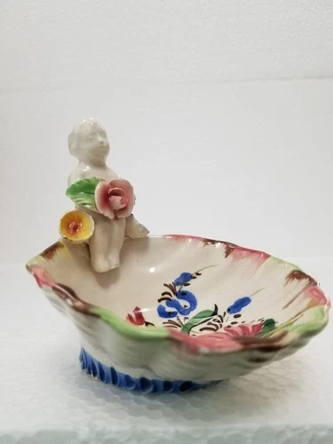 Lovely vintage Italian Majolica pottery ring dish. Majolica is a type of tin-glazed earthenware. With its vibrant multicolor palette and tin glaze finish, this dish is a charming addition to any collection. Crafted in Italy, this unique dish reflects a bygone era of production style and technique. In excellent condition. Just over 3 inches high and 4 inches wide. A little taste of Italy in your home!