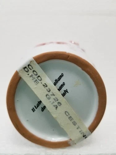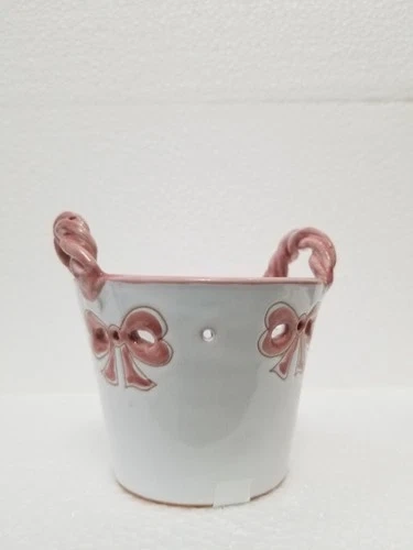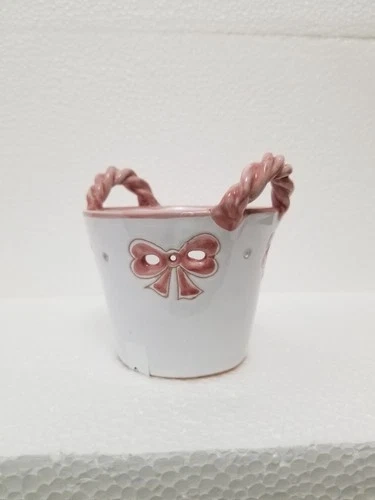 Delight in the charm of this handcrafted Italian ceramic planter basket, a quaint addition to any room. Its pink and white floral pattern boasts a timeless elegance, accented by the basket's twisted handles that add a touch of whimsy. Crafted in Italy, this piece captures the essence of Italian style, complete with a glossy surface that highlights its hand-painted details. 3.5 inches high and 4 inches wide.