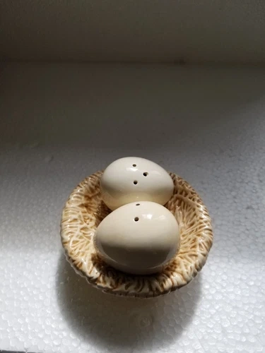 Cute little Salt and Pepper set from Sakura (China). Both shakers designed as two eggs sitting in a basket, it is certainly a novel idea. Excellent condition for all 3 pieces. Like new. 4 inches wide x 2.5 inches high approx.