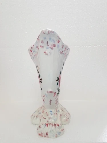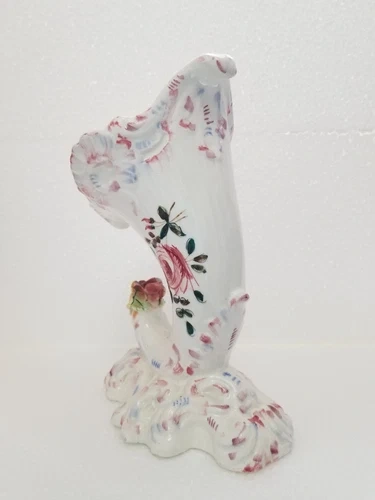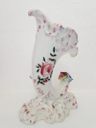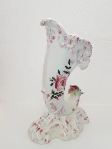 Vintage Italian 'Horn of Plenty' Cornucopia. Very good condition. One small chip as outlined in photo, hardly noticeable. Handpainted in florals, pink, blue, yellow and green against a white background. Lovely, decorative 'catch-your-eye' piece. 9 inches high x 6 inches long x 4 inches wide