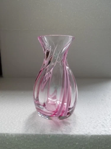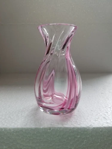 Handblown single bud vase showcases a lovely cranberry/raspberry swirl pattern in clear glass. It has a Caithness-like quality, adding a touch of charm to any space. The delicate pink hue and fine craftsmanship make it an elegant addition to your home decor. Looks lovely in the sunlight. 3 inches wide and just over 4 inches high. No chips or cracks. Good condition.