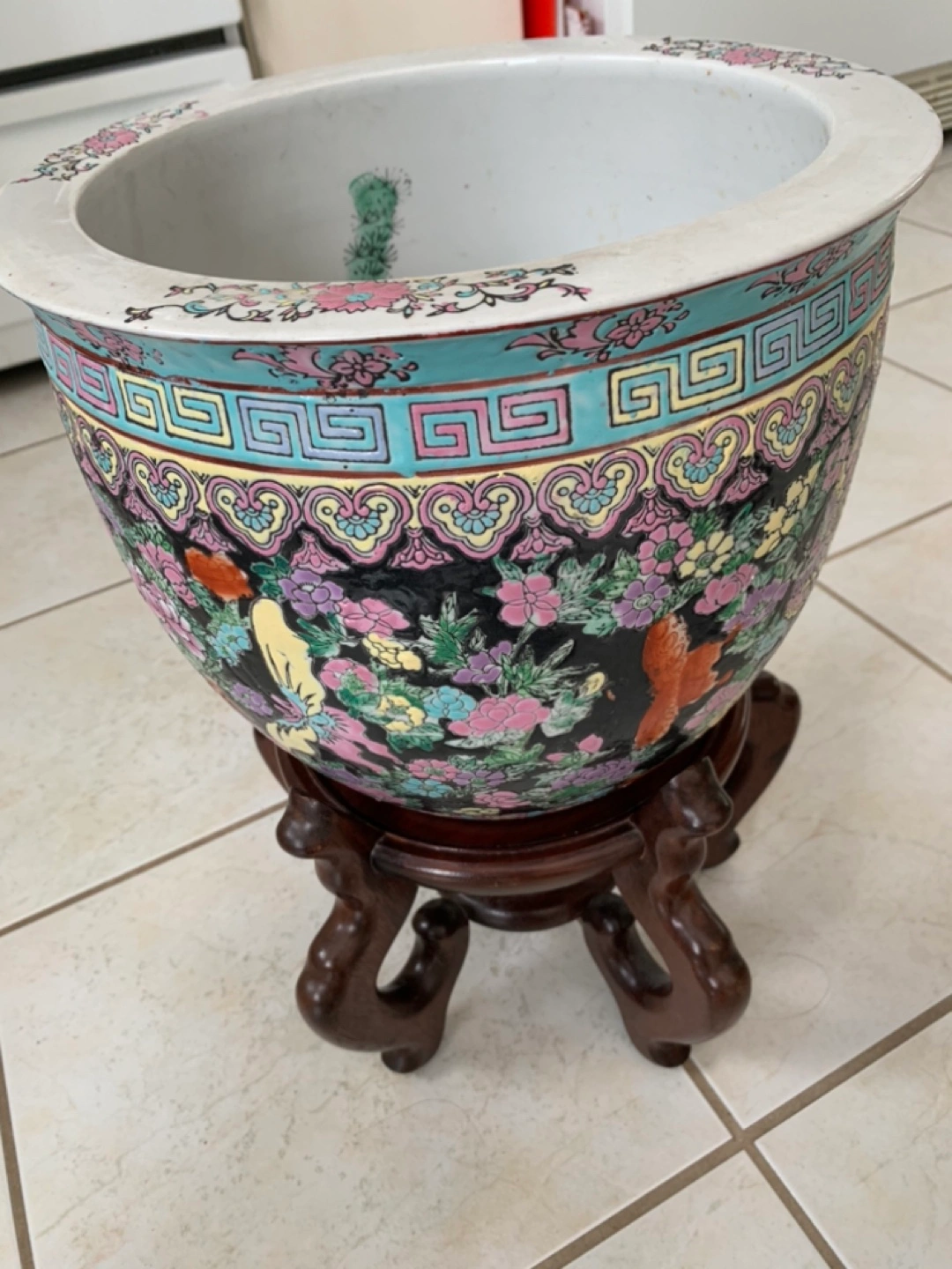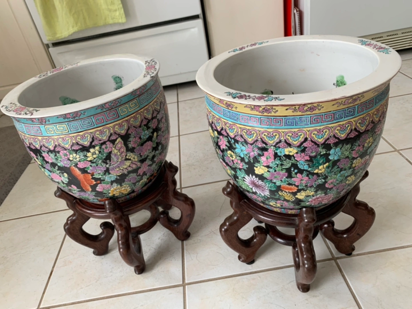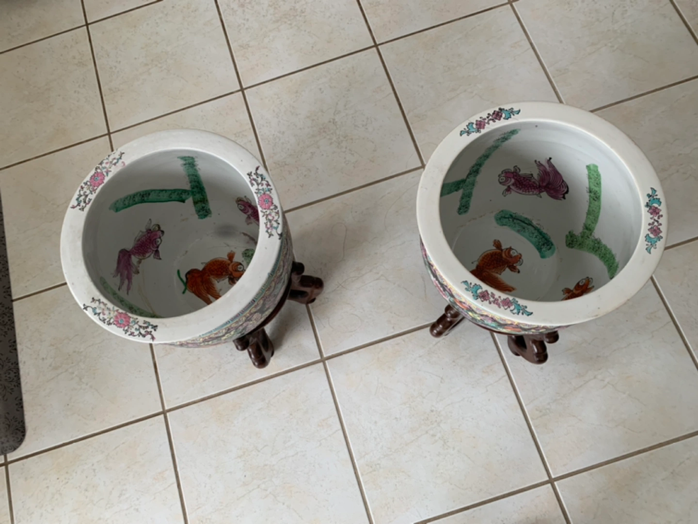 Chinese porcelain fish bowls/planters with rosewood stand