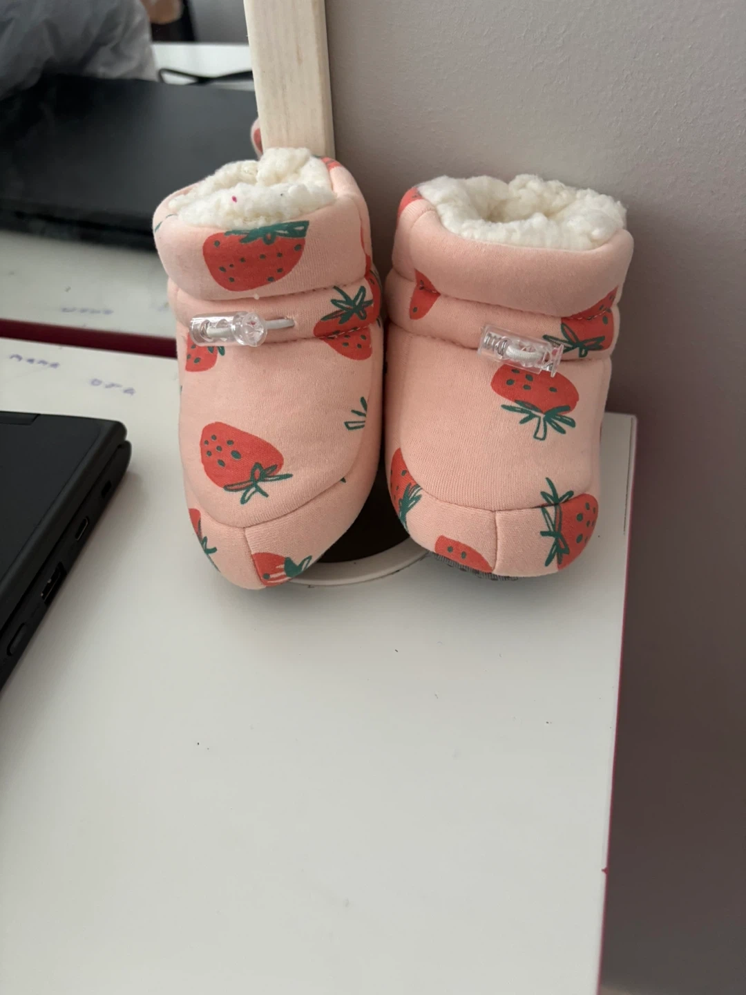 These adorable baby booties feature a cute strawberry print on a soft, pink fabric. They look so cozy with their fluffy lining! Perfect for keeping your little one's feet warm and snug.