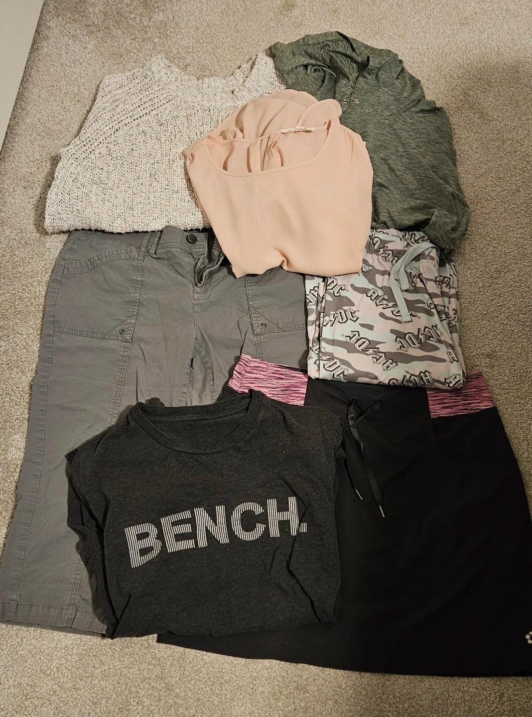 272Gifting a mixed lot of ladies clothing items! Includes a Bench t-shirt, a pair of grey cargo pants, a light pink top, a grey and white sweater, an olive green top, a pair of AC/DC pajama pants, and a black skirt with pink accents. Sizes are small to medium. All in good condition and ready for a new home!