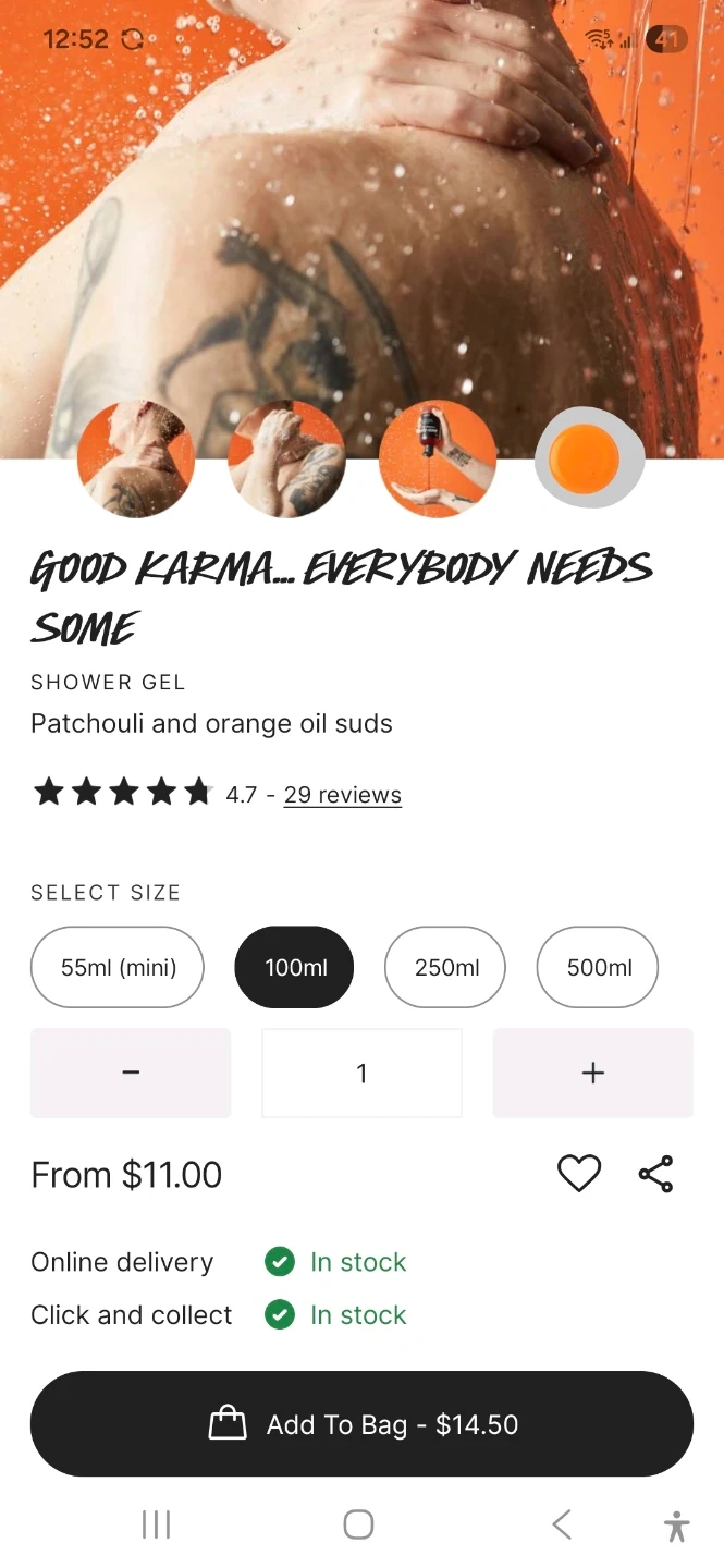 Selling a bottle of Lush Good Karma shower gel! It's the 100ml size and smells amazing with patchouli and orange oil suds