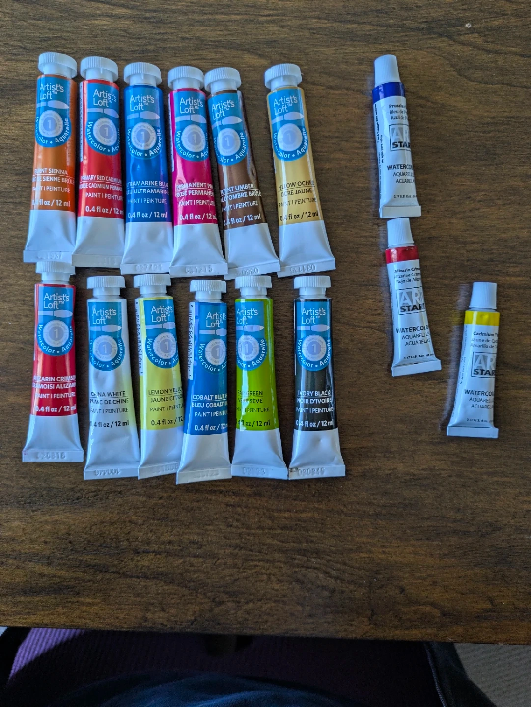 Selling a set of Artist's Loft watercolor paints! Includes a variety of colours like Burnt Sienna, Primary Red Cadmium, Ultramarine Blue, Permanent Rose, Raw Umber, Yellow Ochre, Prussian Blue, Alizarin Crimson, China White, Lemon Yellow, Cobalt Blue, Sap Green, Ivory Black, and Cadmium Yellow. Each tube contains 0.4 fl oz / 12 ml of paint