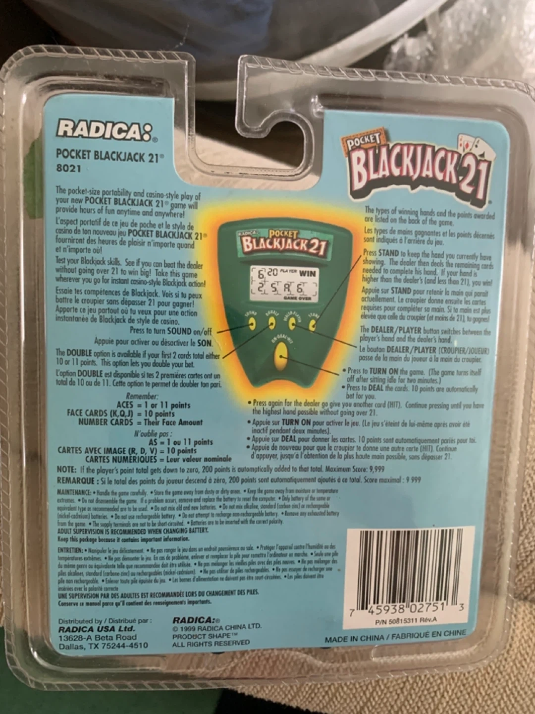 Selling a brand new, in-package Radica Pocket Blackjack 21 handheld game! This pocket-size casino-style game will provide hours of fun anytime and anywhere. It's perfect for testing your Blackjack skills. Press the ON button to start and have fun trying to get 21 to win big! The types of winning hands and the points awarded are included on the back of the packaging