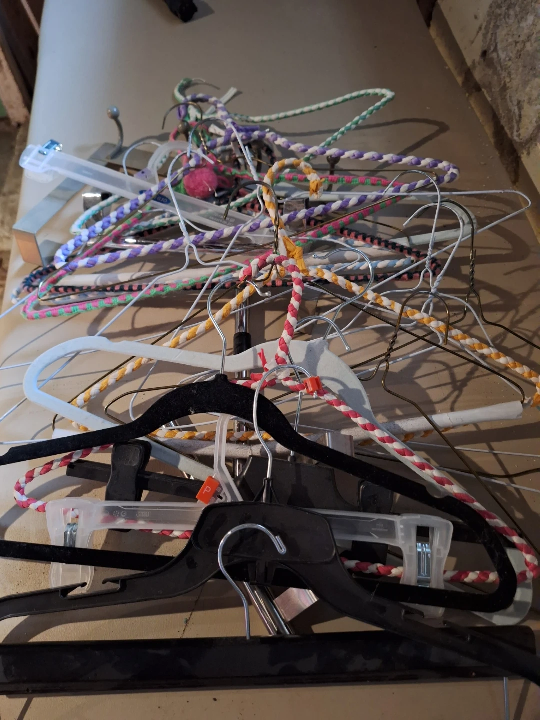 Selling a bunch of clothes hangers in various styles! There are velvet hangers, plastic hangers, and some with clips for pants or skirts. Great for organizing your closet or adding extra hanging space