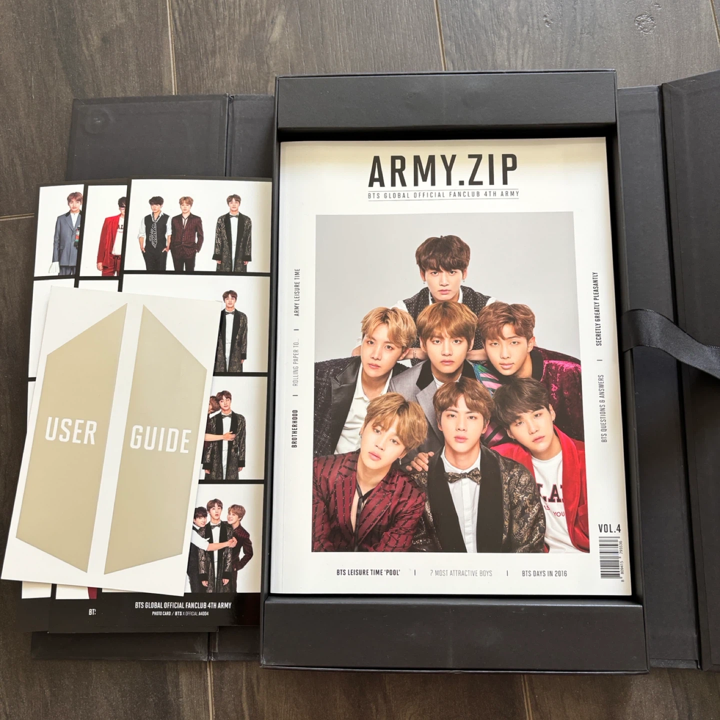 Selling a BTS Global Official Fanclub 4th Army kit! It includes photo cards, an army note, user guide, and photobook.