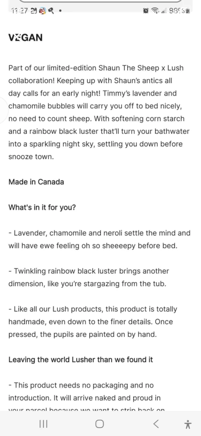 Selling a limited edition Lush Sleepy Timmy bubble bar! This vegan bubble bar is part of the Shaun the Sheep x Lush collaboration. It's designed to carry you off to bed nicely with its lavender, chamomile, and neroli scents. The softening corn starch and rainbow black luster will turn your bathwater into a sparkling night sky. It's a 100g bubble bar, handmade with painted-on pupils.