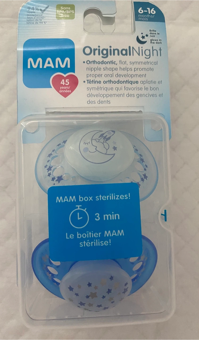 Selling a new pack of MAM Original Night pacifiers, perfect for babies aged 6-16 months! These pacifiers have an orthodontic, flat, and symmetrical nipple shape to help promote proper oral development. Plus, they glow in the dark, making them easy to find at night!