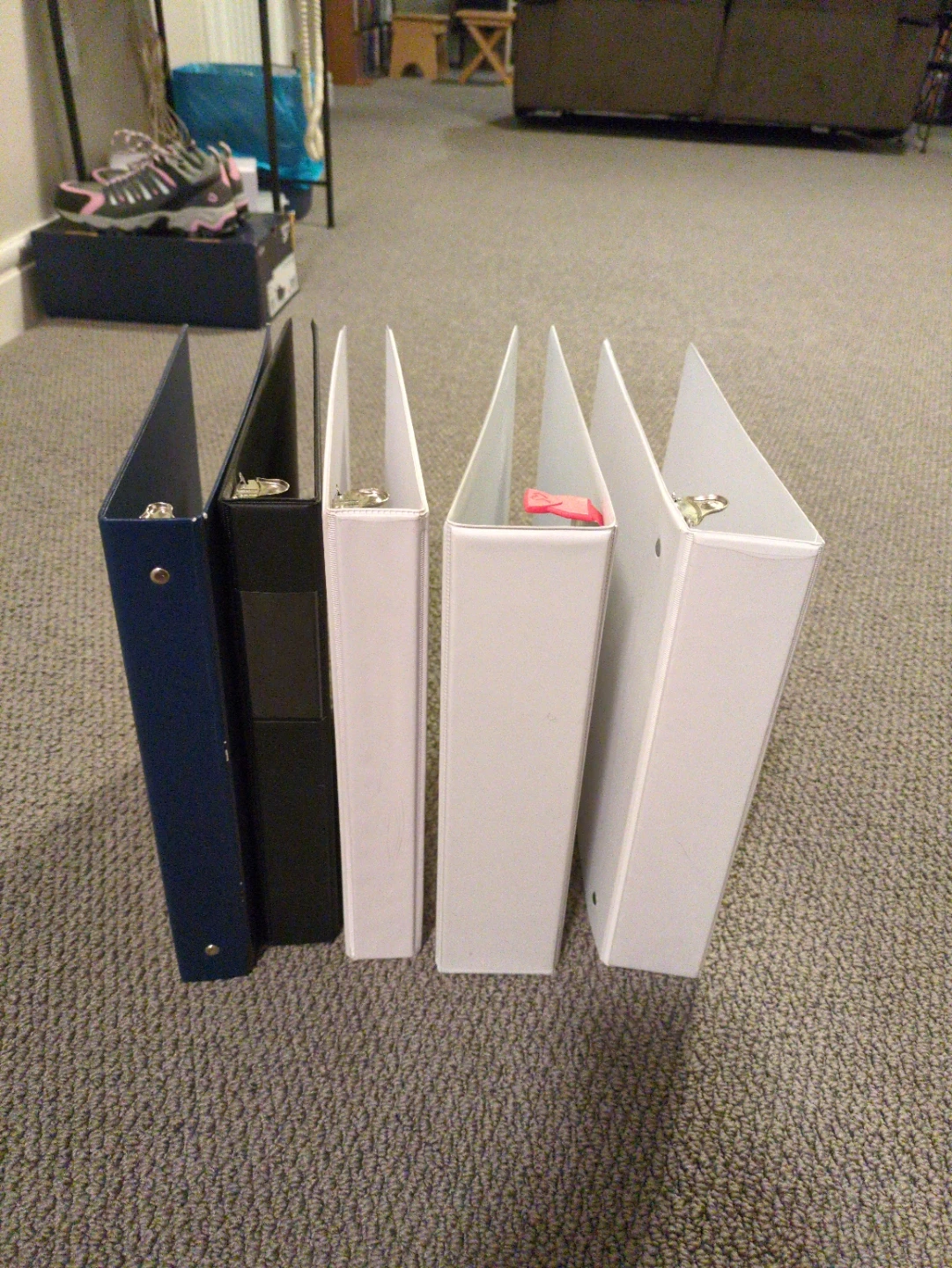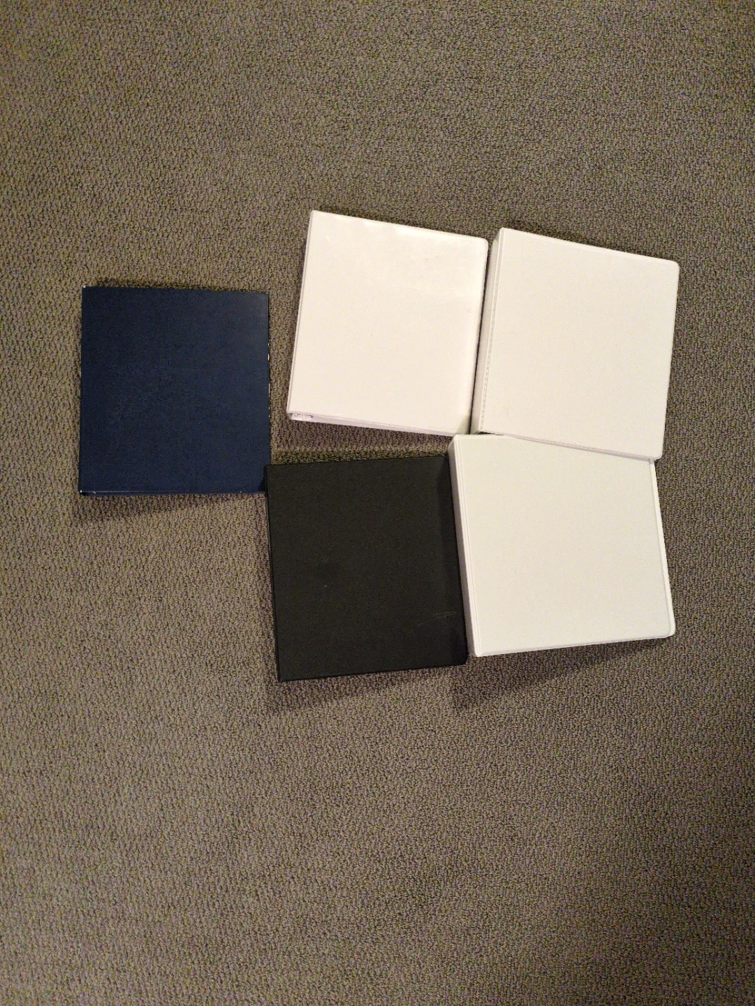 Free binders in good condition. There's one blue, one black, and three white binders. Great for organizing school work or documents!