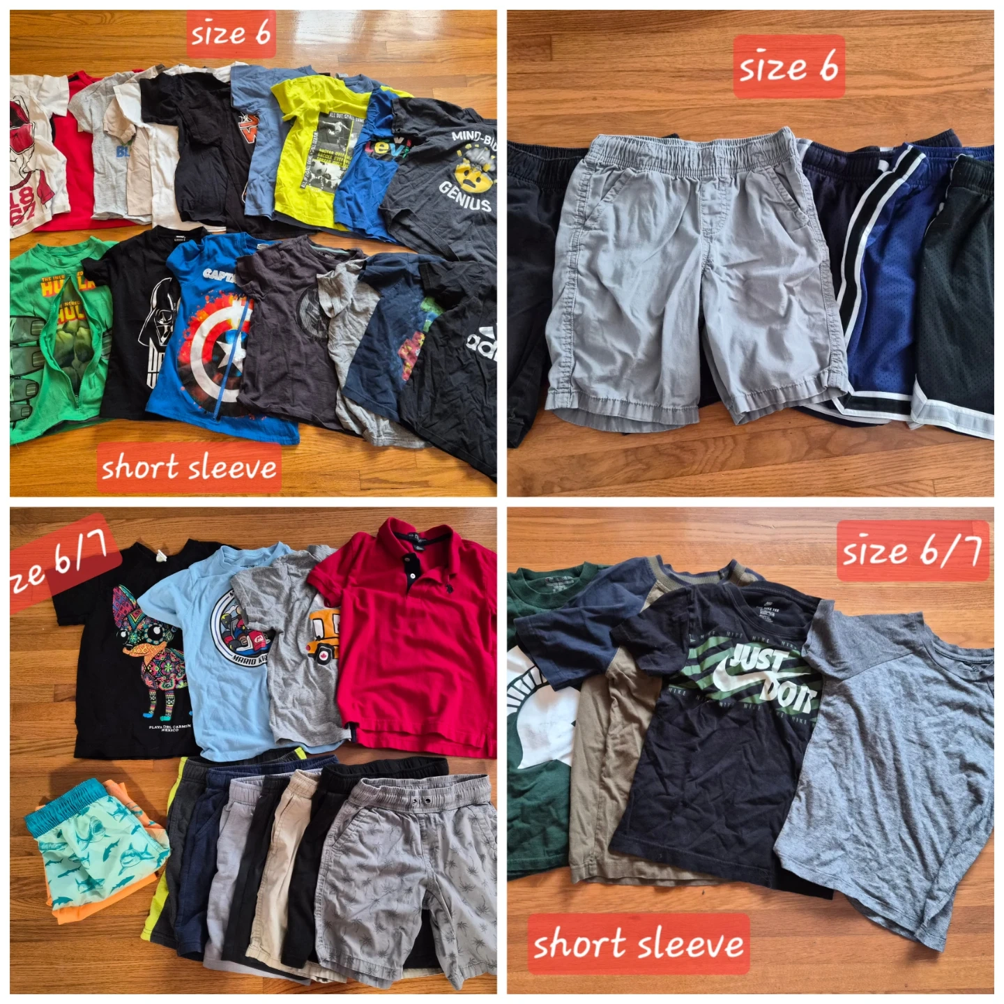 Selling a big bundle of boys' clothes! Includes a mix of short-sleeve shirts, shorts, and even a swimsuit. Sizes are mostly 6 and 6/7. Perfect for summer!