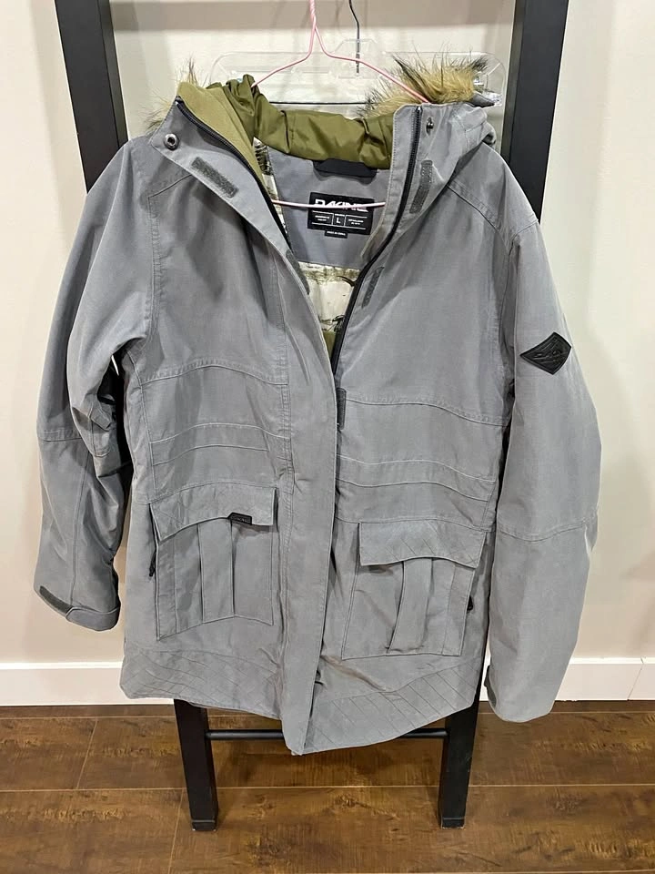 Large, Dakine women's boarding jacket. Slim fit, like new condition. Worn 3x on the mountain. Faux fur trim on hood, powder skirt, interior zipper pocket on chest + zipper pocket on sleeve for lift pass.
