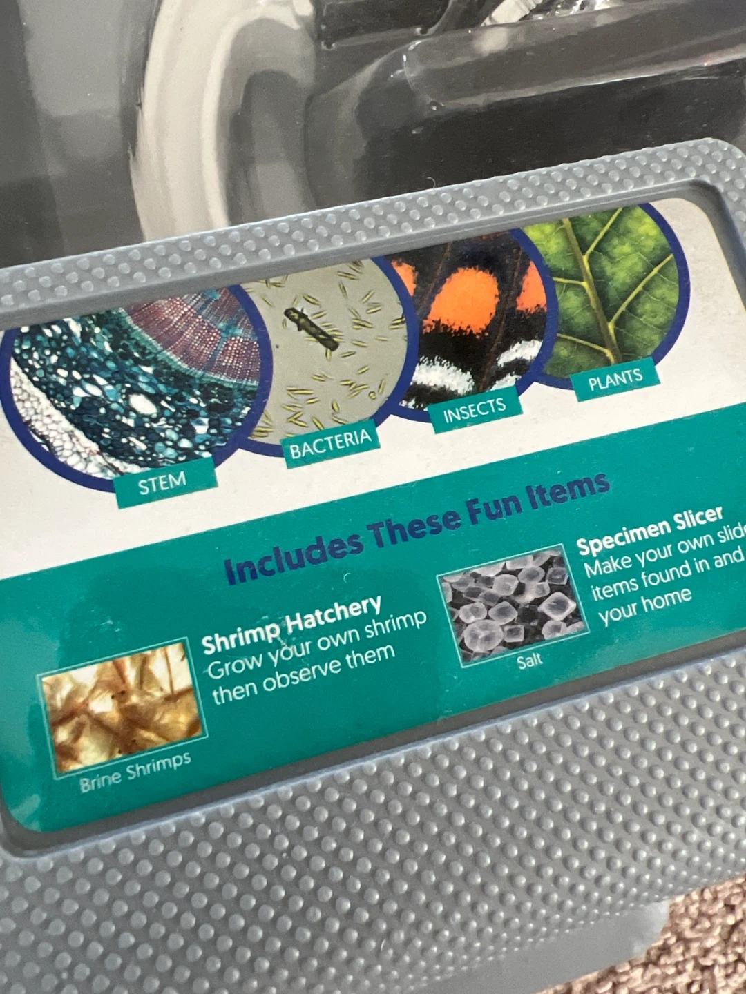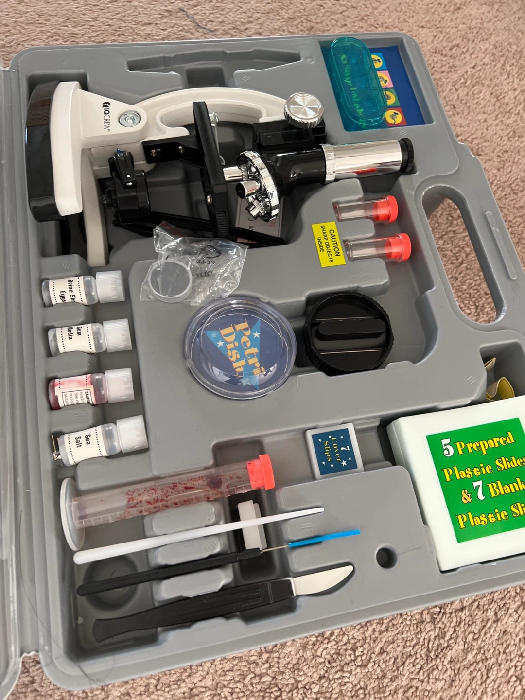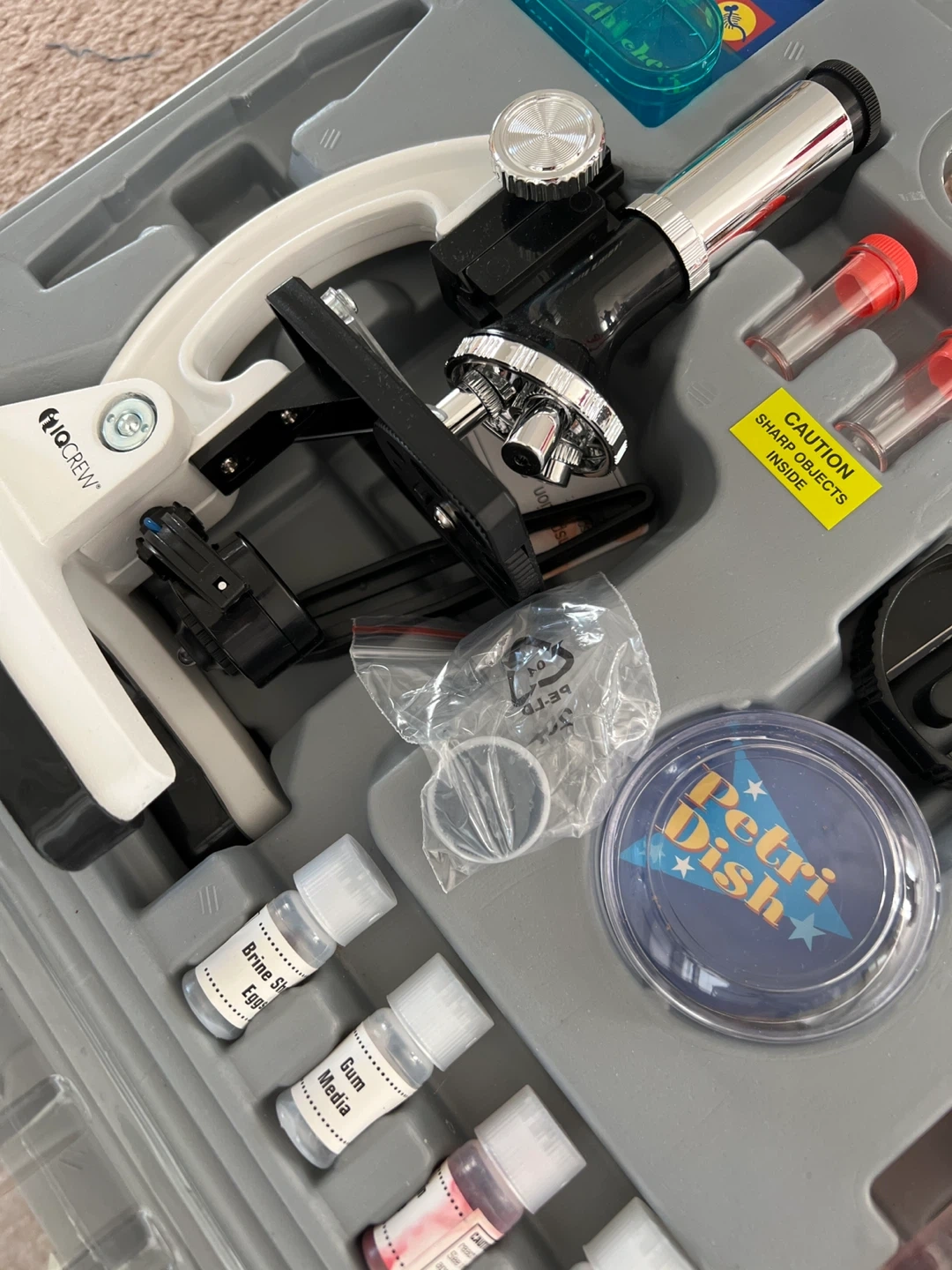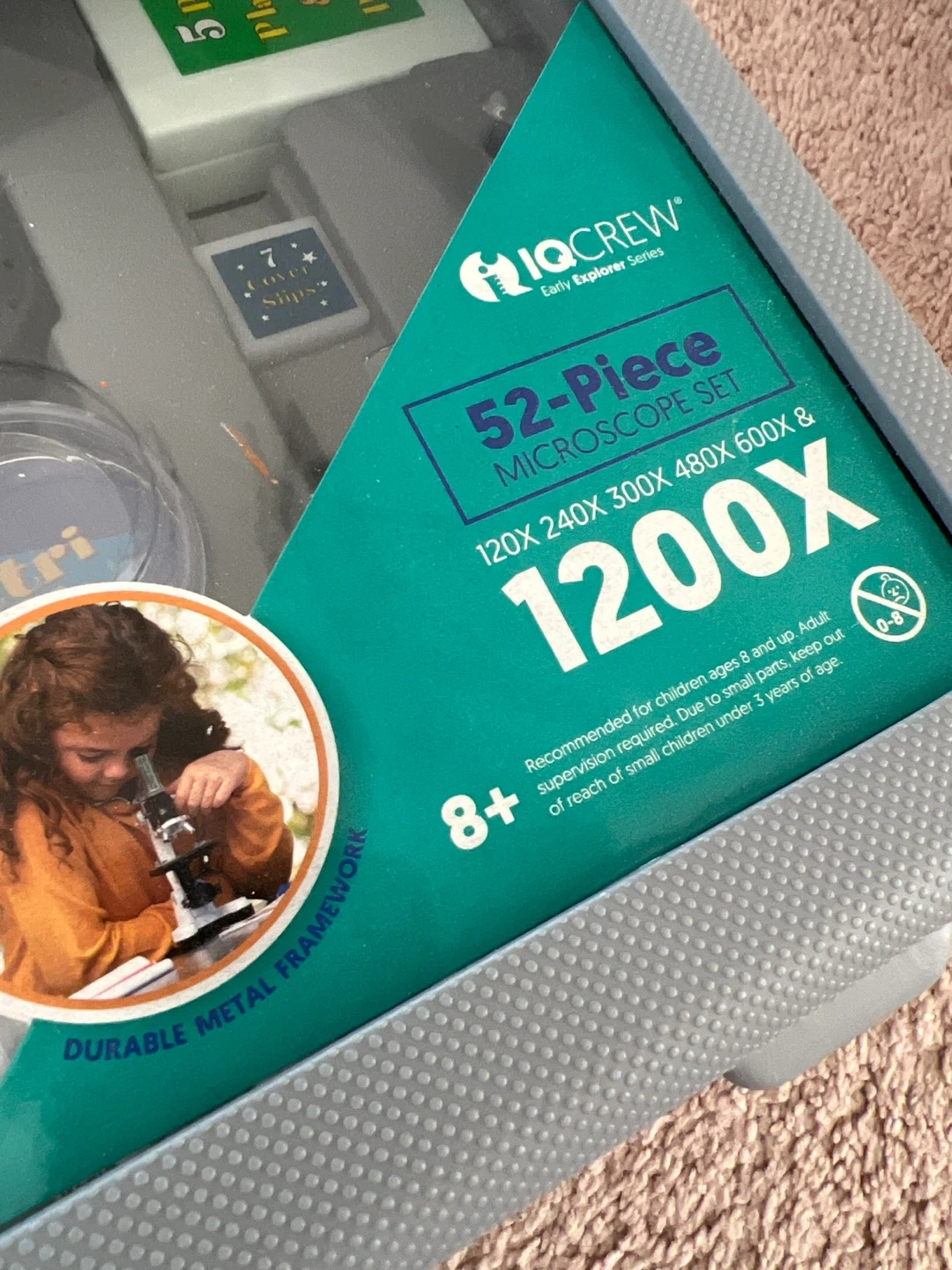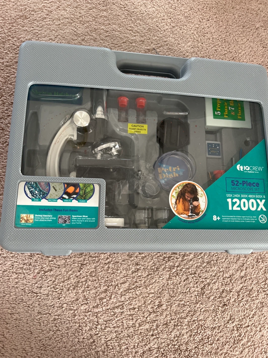 Selling an IQ Crew 52-piece microscope set! It magnifies from 120x to 1200x. It's recommended for children ages 8 and up, and adult supervision is required. The set includes prepared plastic slides, blank plastic slides, and a petri dish. Comes with a durable metal framework.