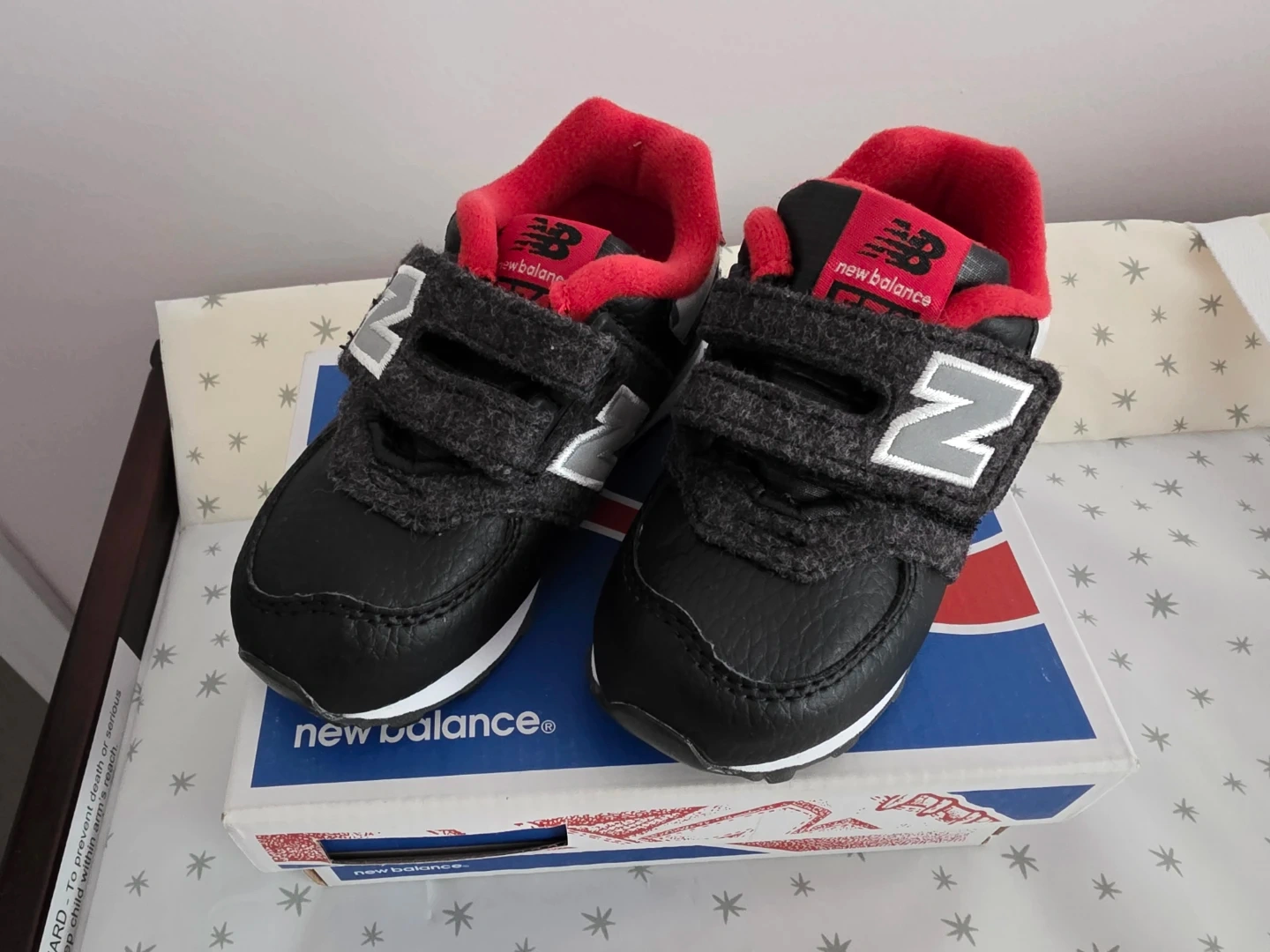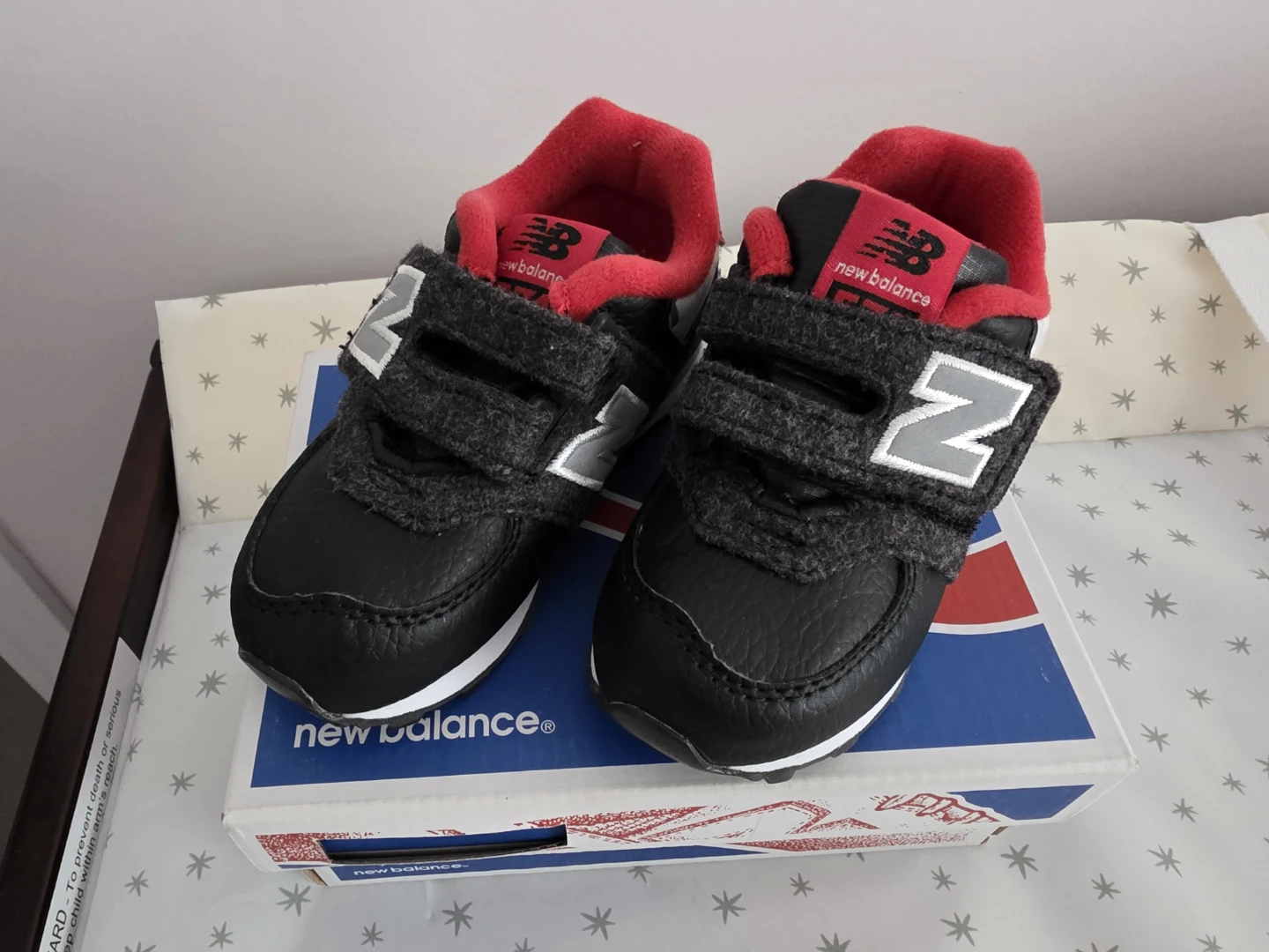 New Balance 574 toddler sneakers in size 7. These cute sneakers feature a black and grey colour scheme with a red interior. They have a velcro strap for easy wear. The original box is included!