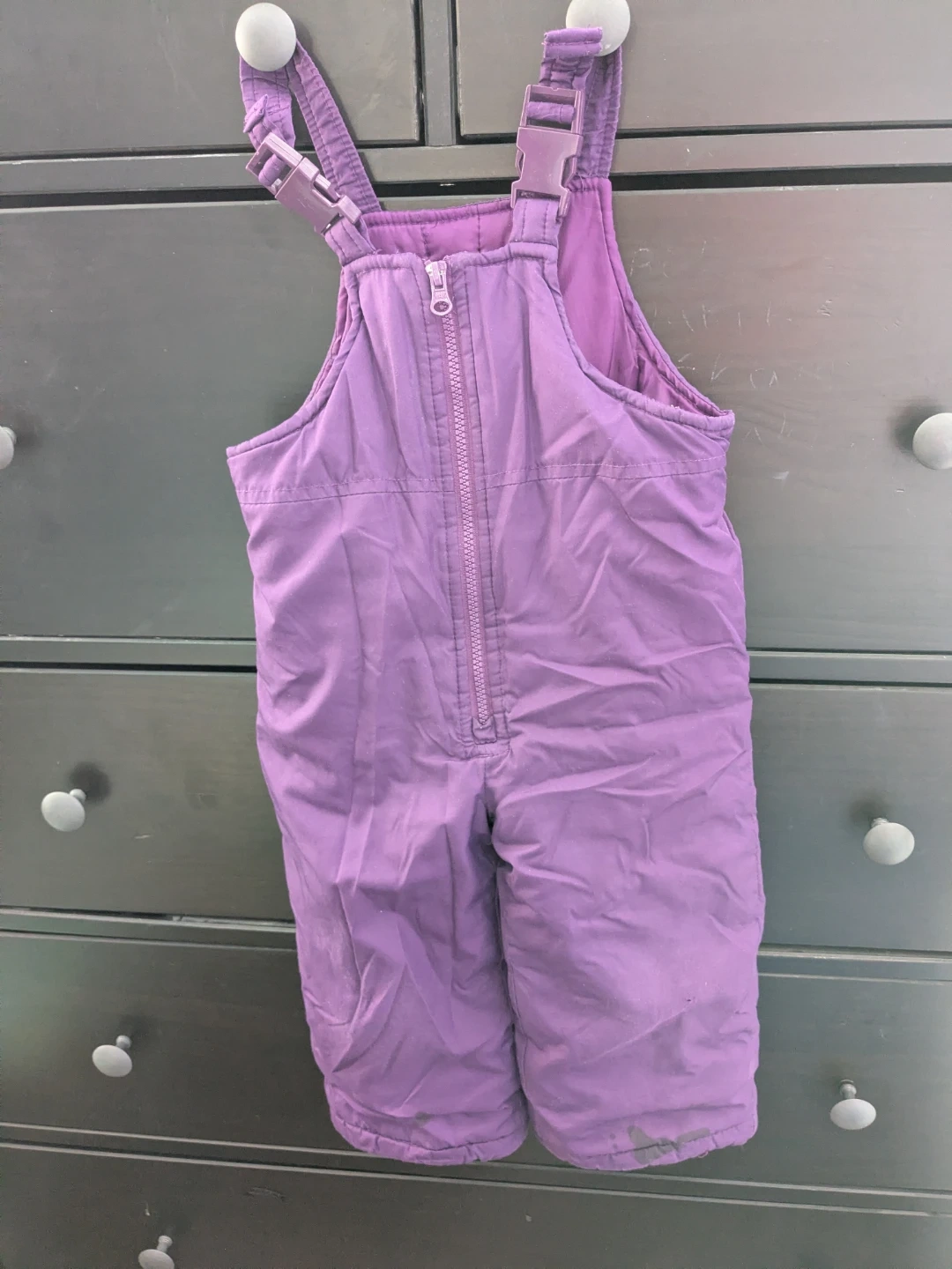 Selling a Weathertamer snowsuit in a lovely purple colour! It's sized for 24 months. There are some signs of wear, including some dark marks on the legs and some fraying at the bottom of the legs.
