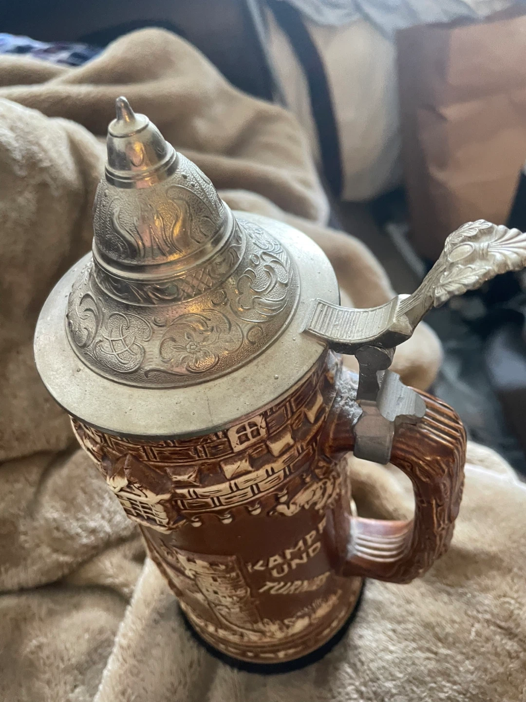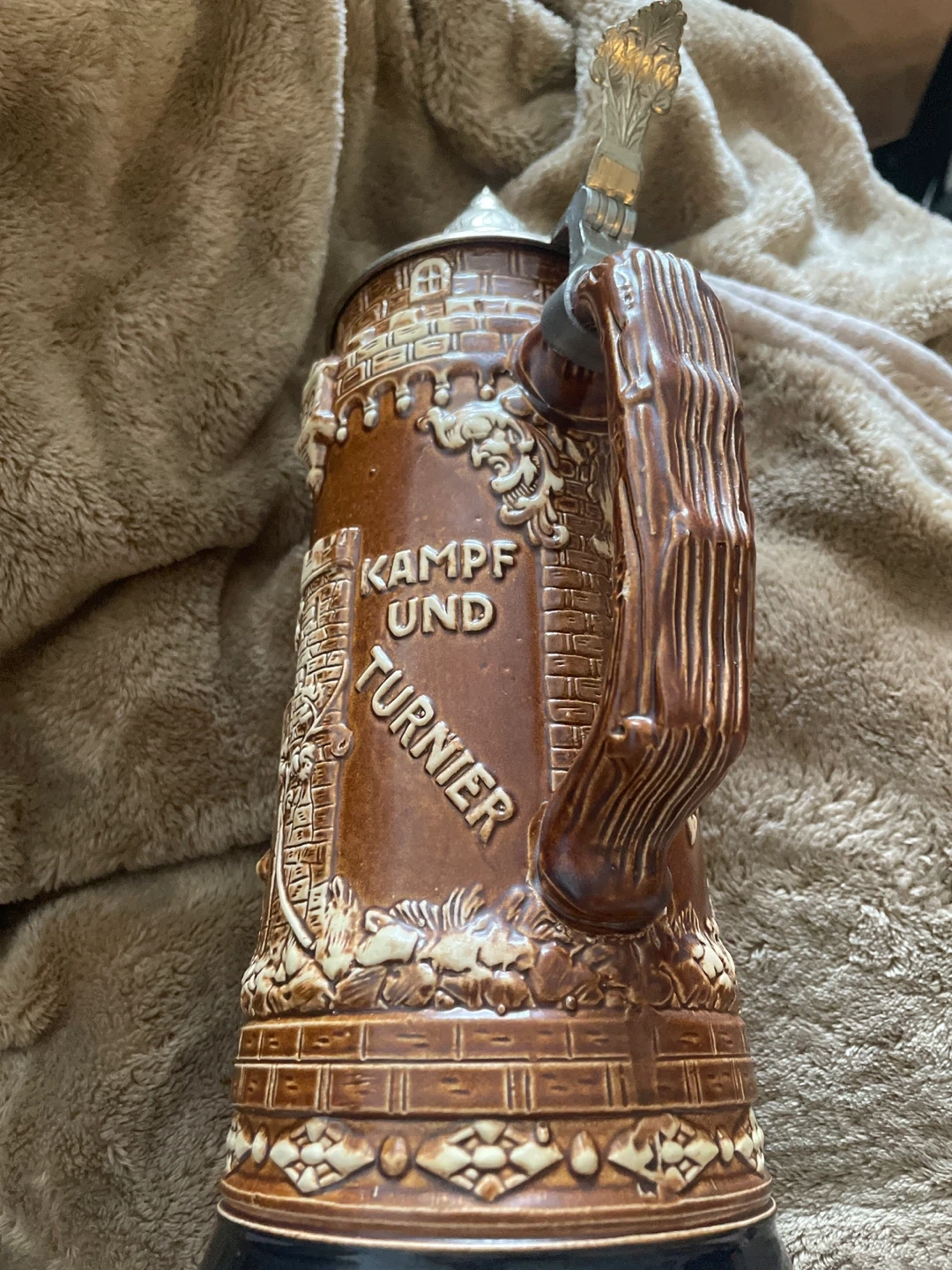 Selling a Kampf Und Turnier beer stein. It's brown with a silver-coloured lid and handle. The stein features intricate designs, including buildings and figures. Perfect for collectors or anyone who enjoys traditional German beer steins