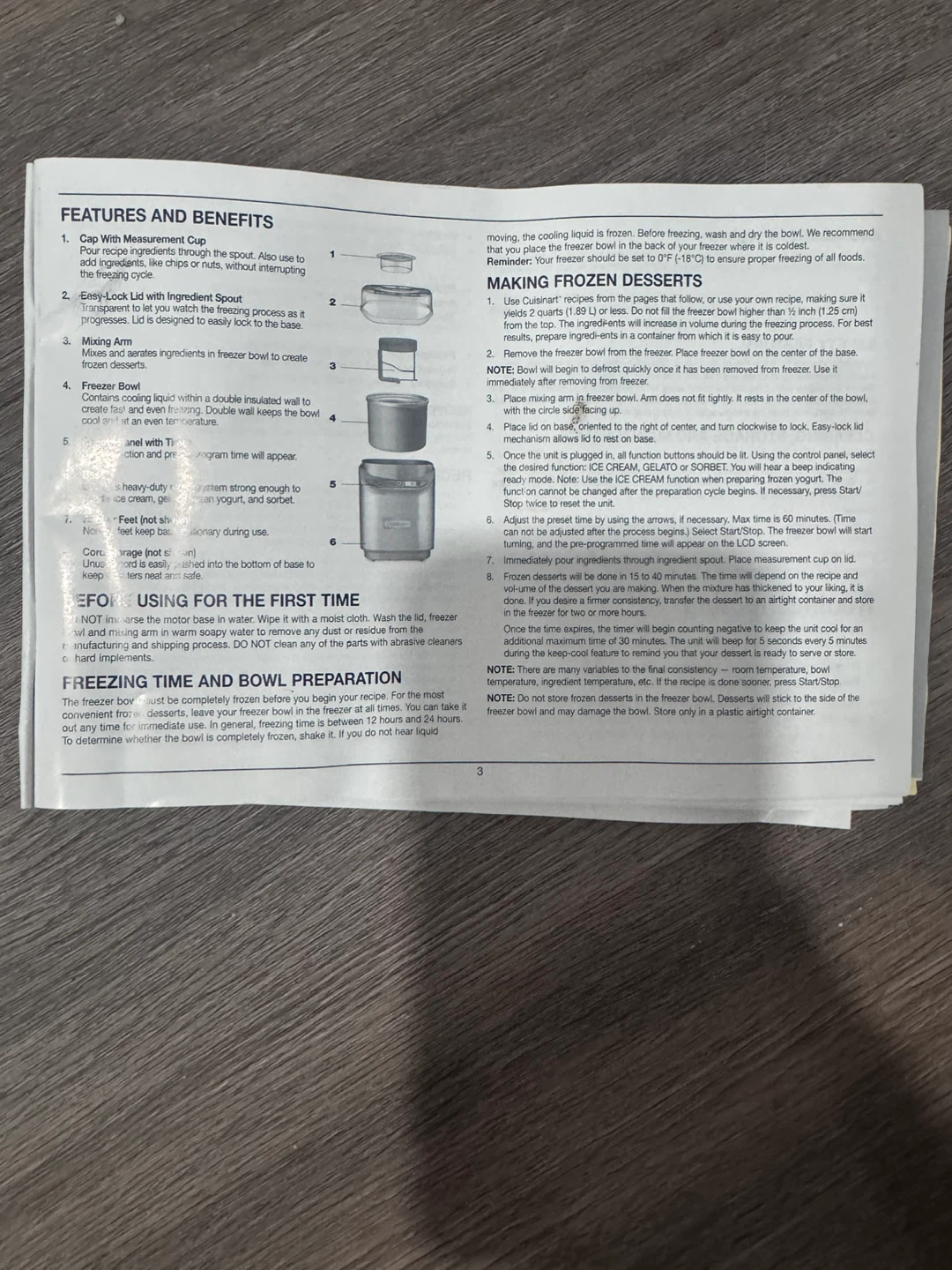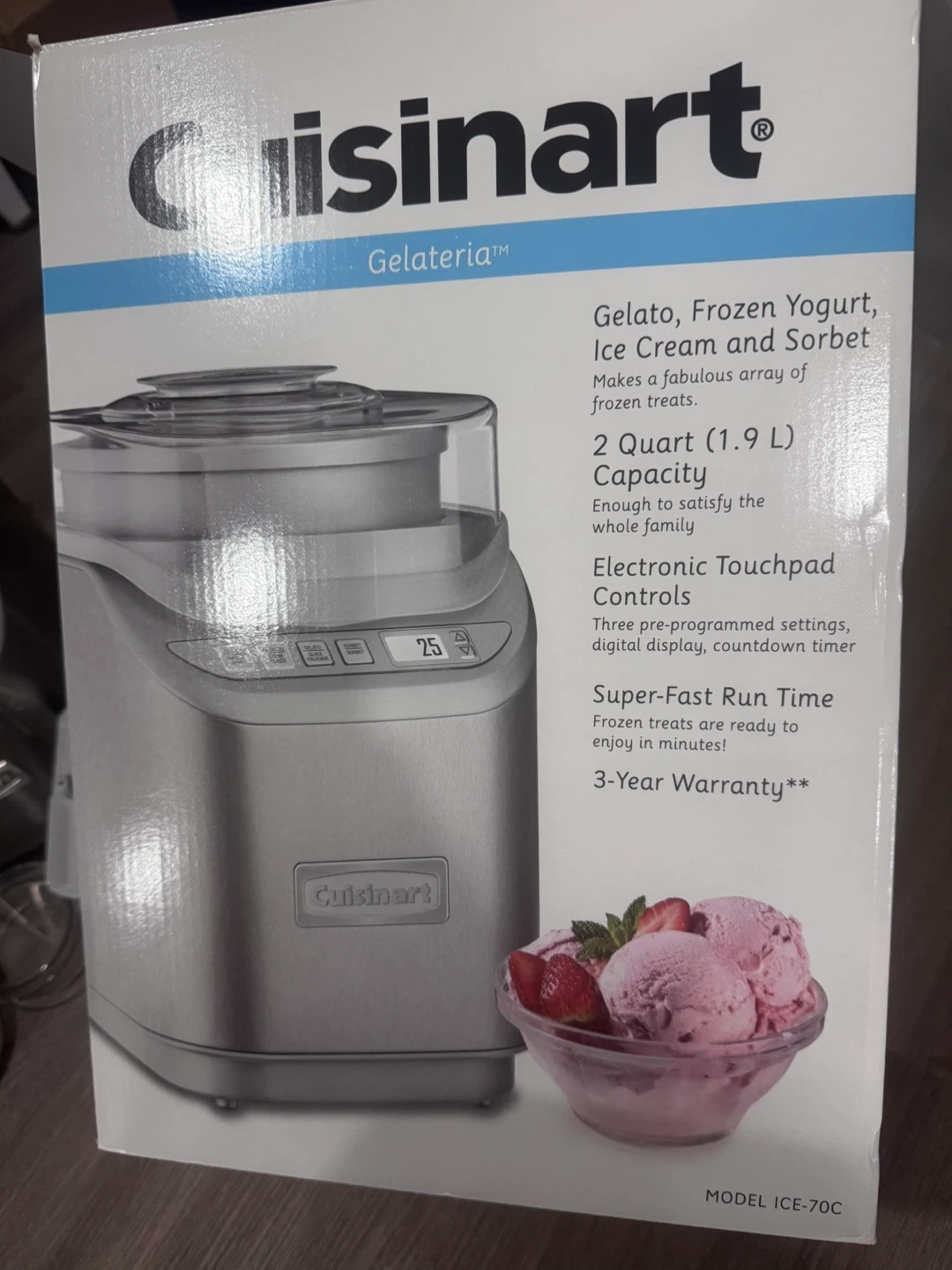 Get ready to make some delicious frozen treats with this Cuisinart Gelateria ICE-70C! It makes gelato, frozen yogurt, ice cream, and sorbet. It has a 2 quart (1.9 L) capacity, perfect for the whole family. The electronic touchpad controls make it easy to use, with three pre-programmed settings, a digital display, and a countdown timer. The box and manual are included!