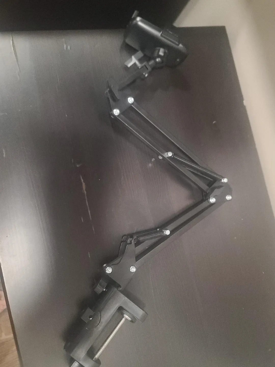 Selling an adjustable microphone boom arm stand in black. It's in great condition and perfect for podcasting, streaming, or recording music. It features a clamp for easy attachment to desks or tables. Get your sound setup just right!
