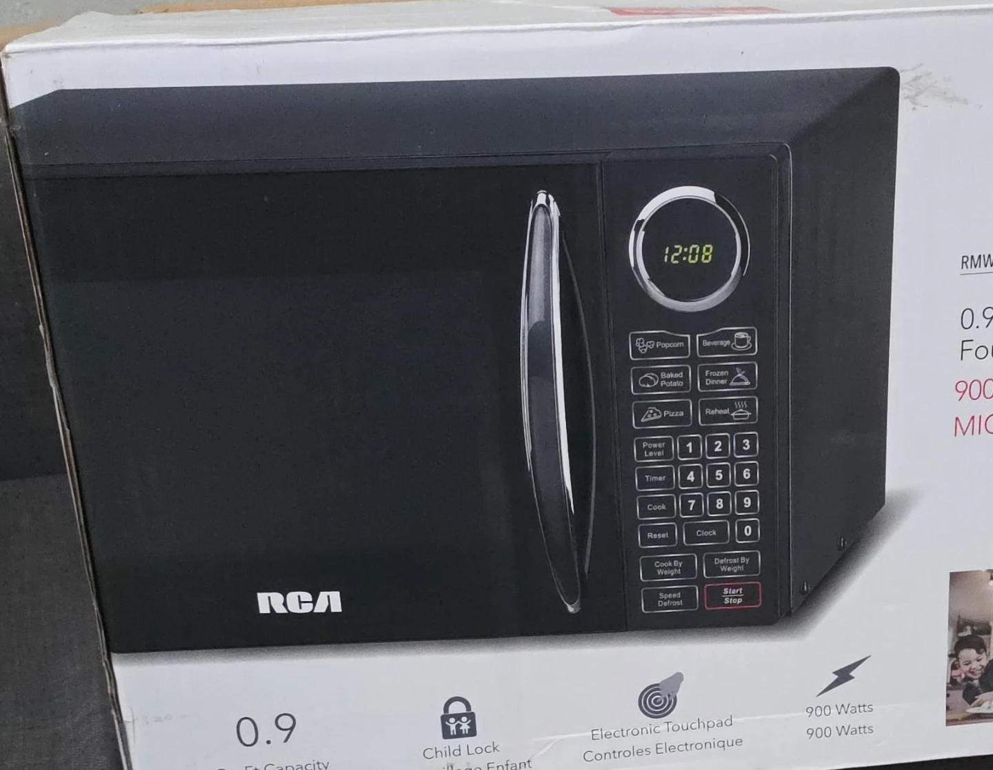 Selling a black RCA 0.9 cu. ft. microwave. It's in great condition and ready to use! It features an electronic touchpad for easy control and has 900 watts of power. Perfect for quick meals and snacks!