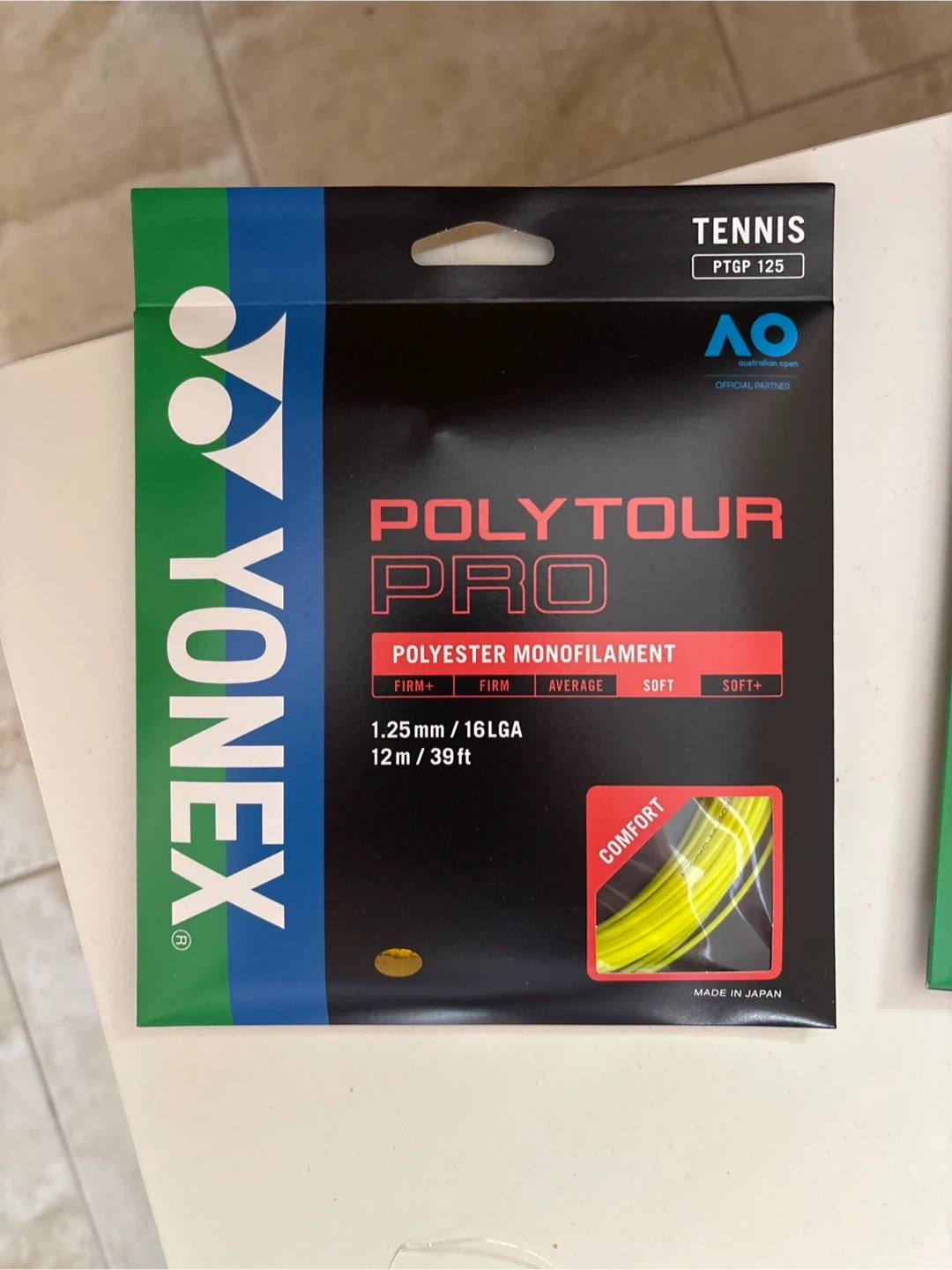 Selling a pack of Yonex Poly Tour Pro tennis string! It's a polyester monofilament string designed for comfort and performance. The string is 1.25mm / 16LGA and 12m / 39ft in length