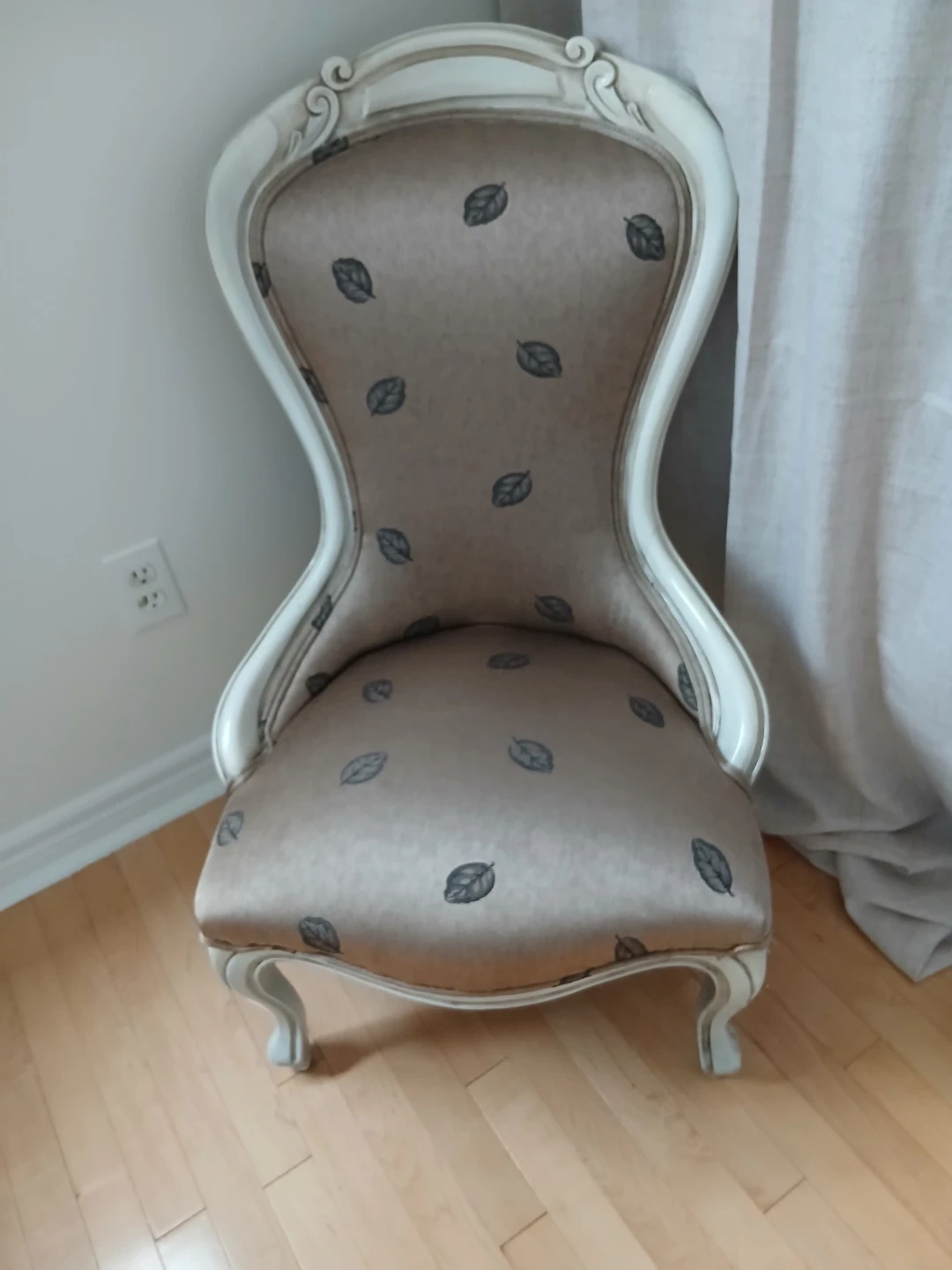 Selling a lovely accent chair! It features a charming leaf pattern on a beige fabric. The frame is a stylish white. Perfect for adding a touch of elegance to any room in your home