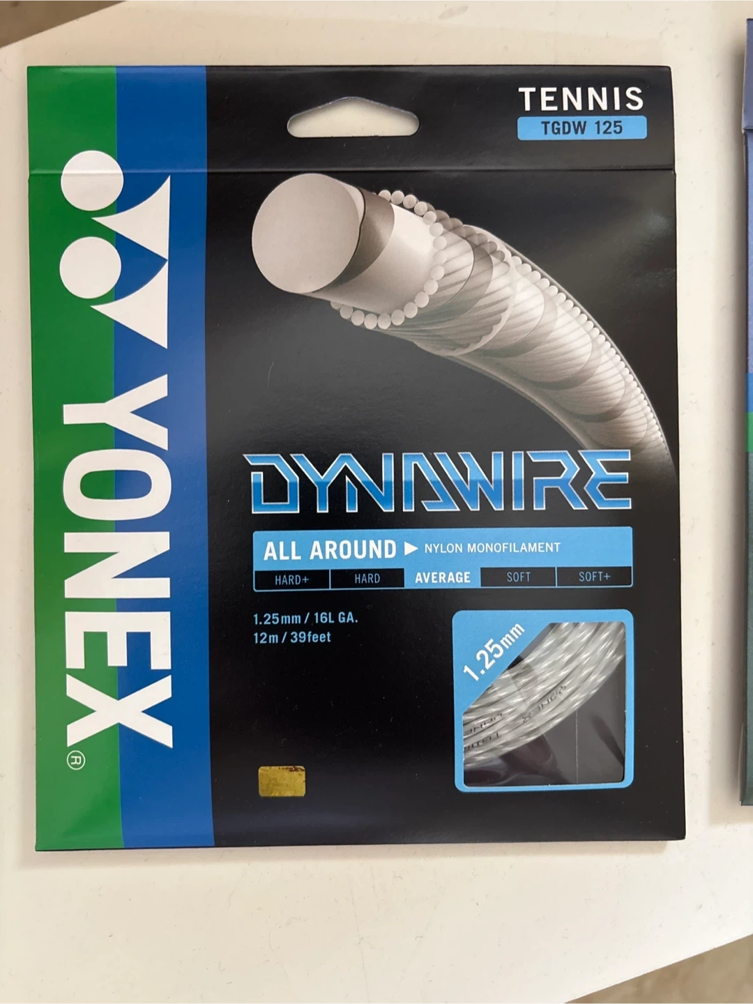 Selling a brand new package of Yonex Dynawire tennis string! It's the TGDW 125 model. This string is an all-around nylon monofilament, measuring 1.25mm / 16L GA and 12m / 39 feet