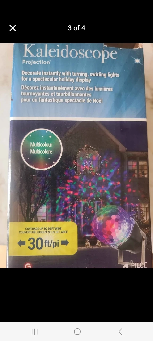 Decorate instantly with turning, swirling lights for a spectacular holiday display with this kaleidoscope projection light! It covers up to 30 ft wide and projects multicolour lights. The box is included