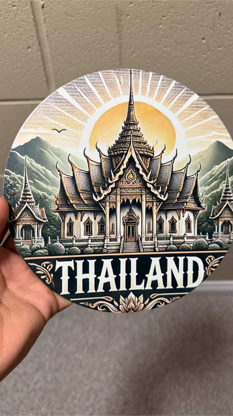 Selling a round metal sign featuring a temple and landscape design with 'Thailand' written on it. It's in great condition and ready to add some character to your space