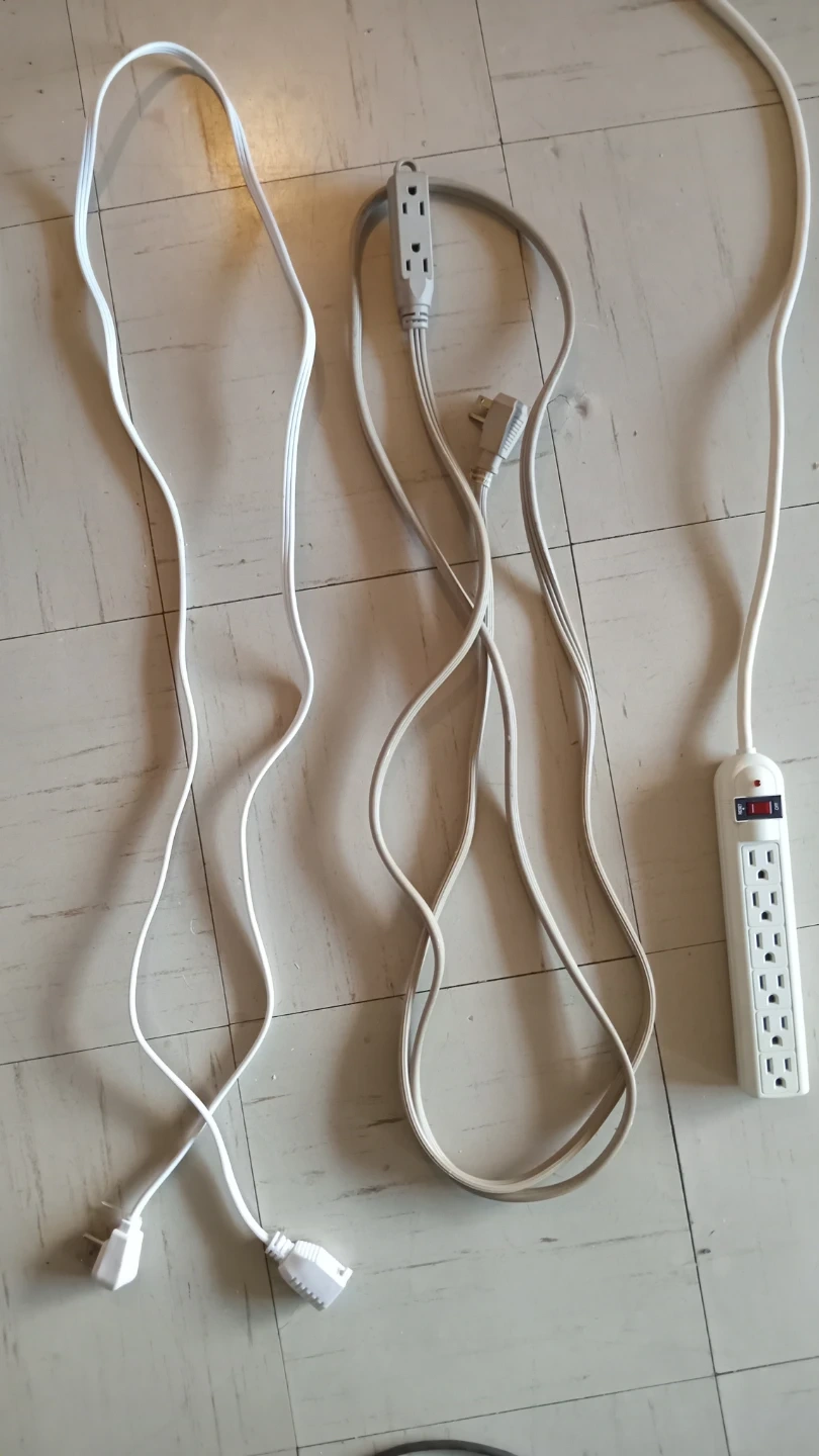 43Selling a set of white power extension cords. Great for adding extra outlets where you need them! Size : the 6 plug power cord is 3 feet long Long grey cord is about 100 in long The white cord is about 6 feet long All for 12 dollars Or 4 dollars each