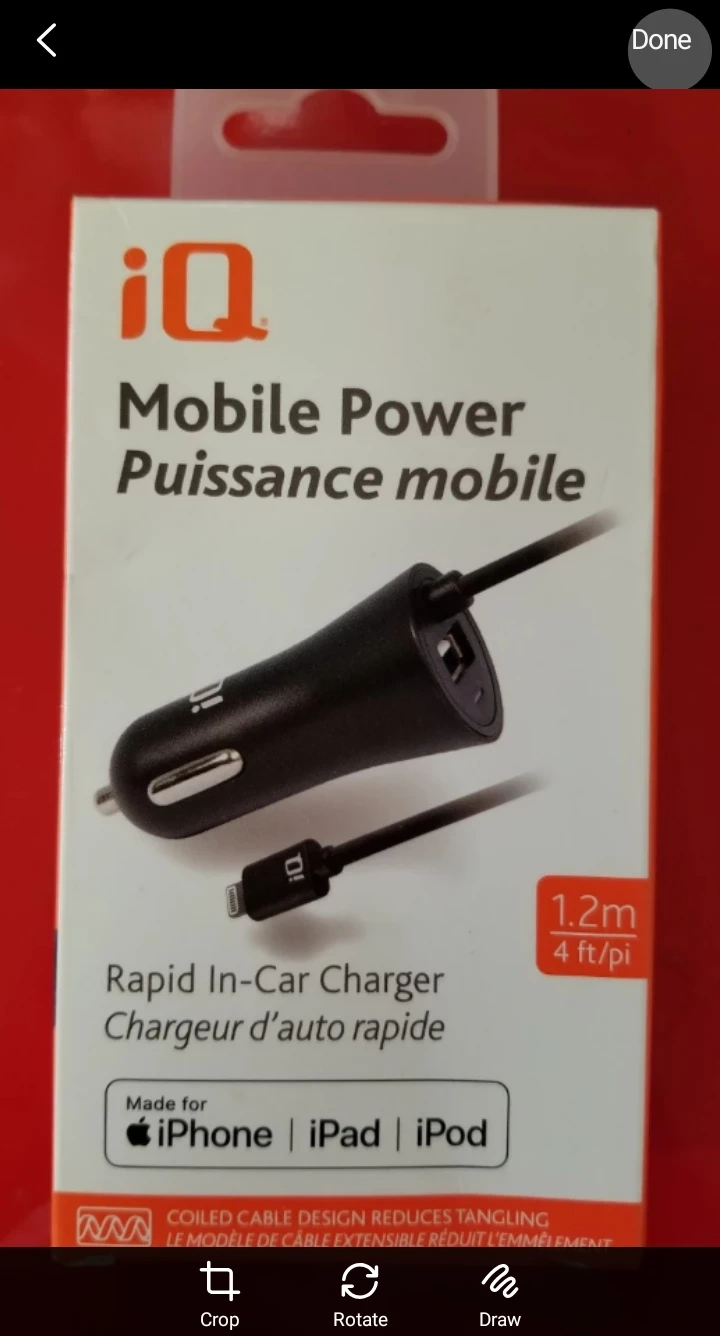 Selling a new iQ Mobile Power lightning dual rapid in-car charger! It's compatible with iPhone, iPad, and iPod. The charger has a coiled cable design to reduce tangling and 3.4A total combined power output. Box included!