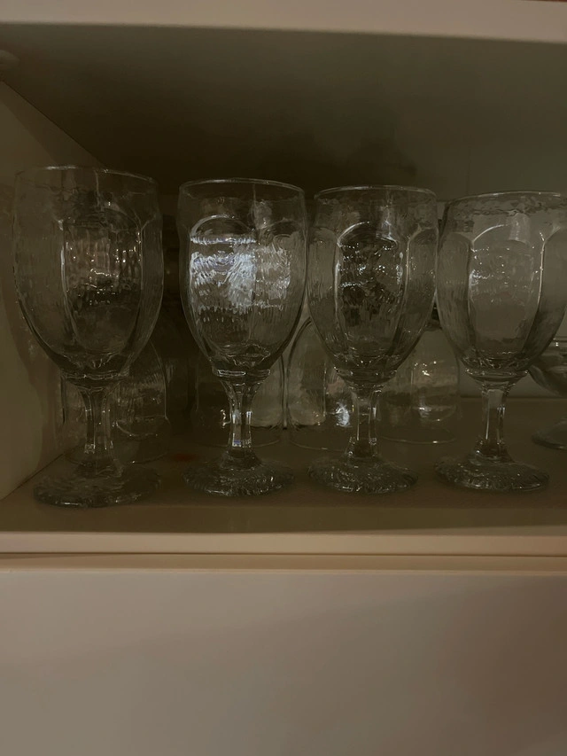 Enhance your dining experience with this set of 12 elegant wine glasses, each featuring a textured design and sturdy stem. These glasses are in used but good condition, ready to bring sophistication to your next dinner party. These wine glasses have an eye-catching design that are sure to impress your guests. * Set includes 12 glasses * Textured glass design * Classic stemware shape Based on similar listings, a set of 12 wine glasses in this condition typically sells for between $20 and $40. I've priced this set at a competitive rate to ensure a quick sale. If the ad is up, the glasses are available!