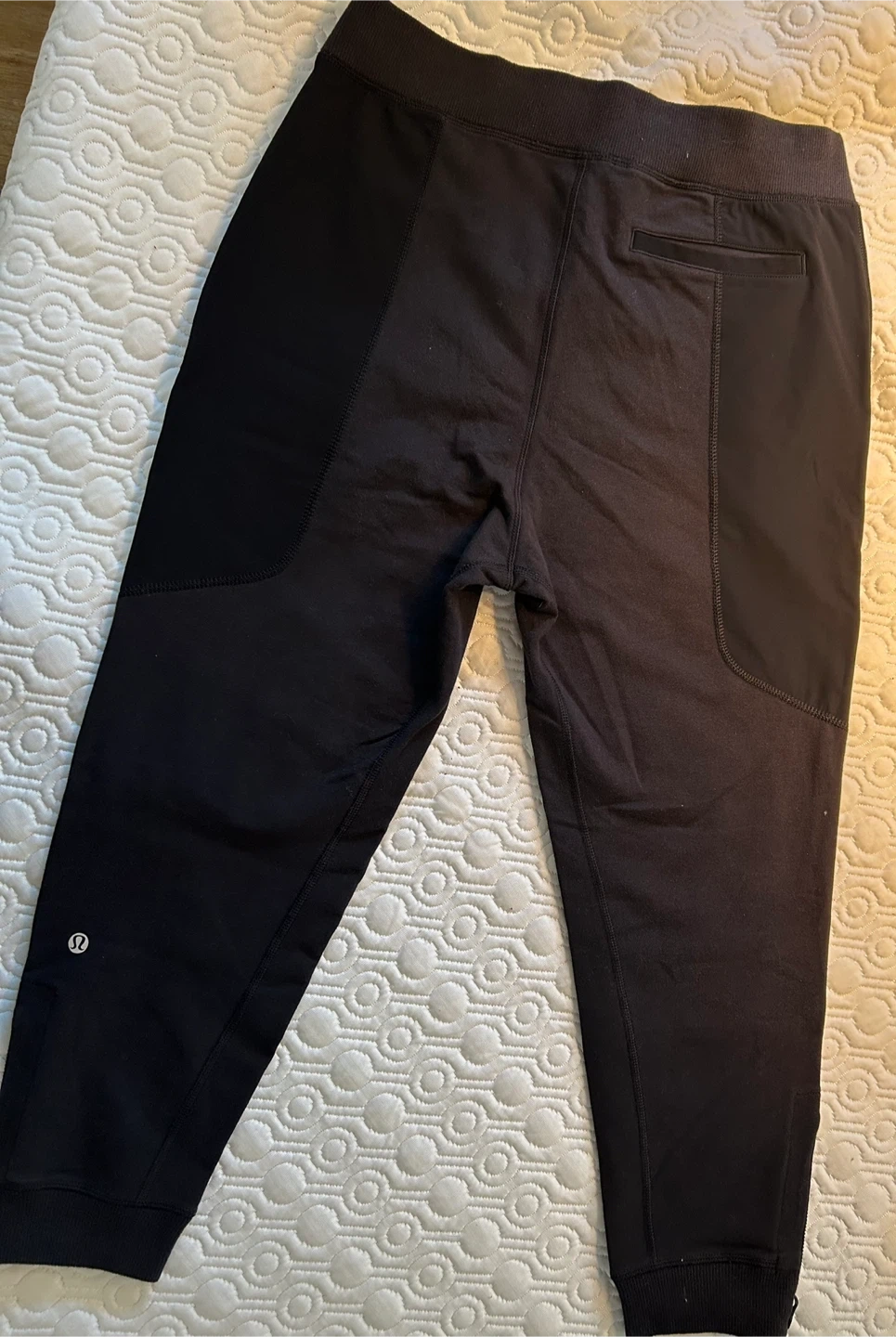 Selling a pair of Lululemon Athletica jogger pants in black. They are size 8 and made with a blend of cotton and spandex for a comfortable fit. The pants feature contrast panels with varying percentages of cotton, spandex, nylon, and LYCRA®.
