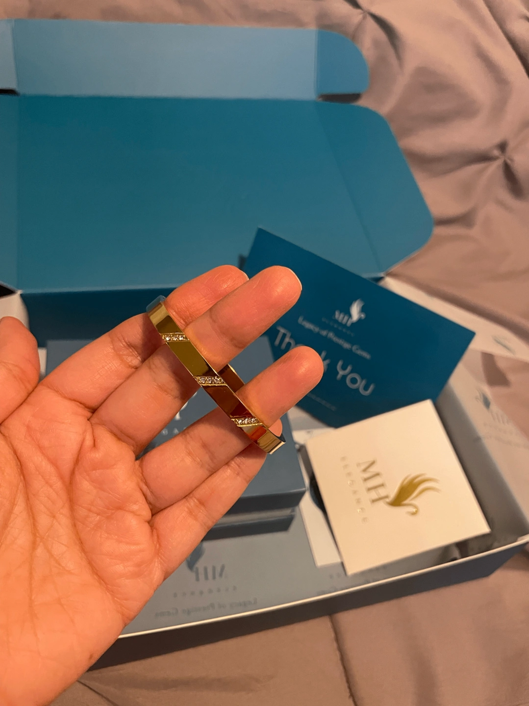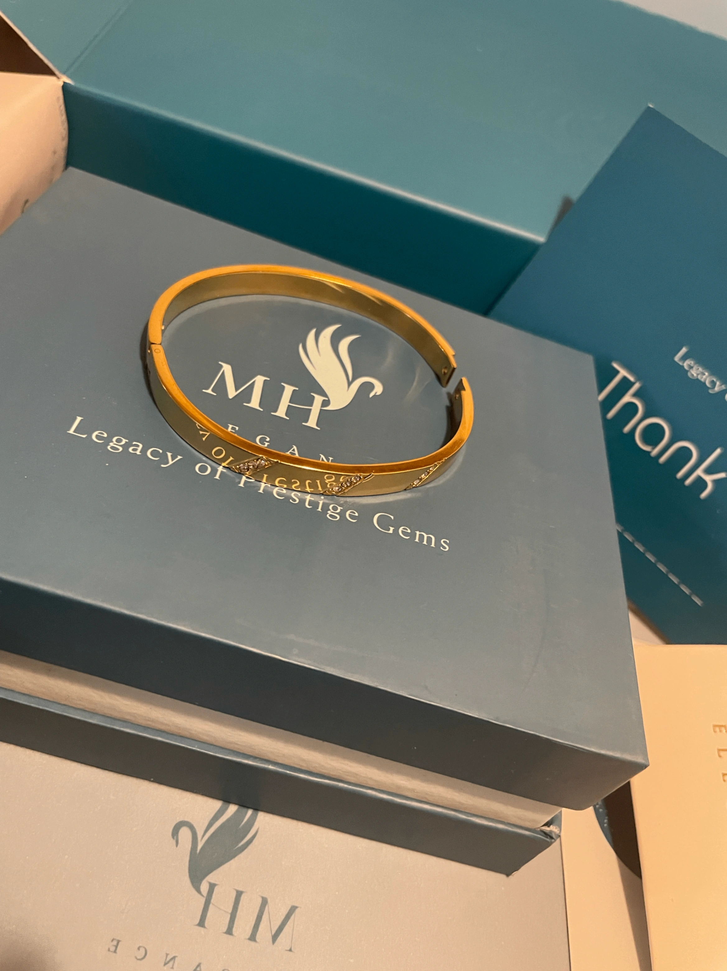 Crafted from durable stainless steel and finished with 18K gold Plated, this piece brings sophistication and shine to your wrist without compromising on comfort. Inspired by the elegance of luxury styles like the Cartier bangle bracelet, the Elysian is perfect for stacking or wearing solo.