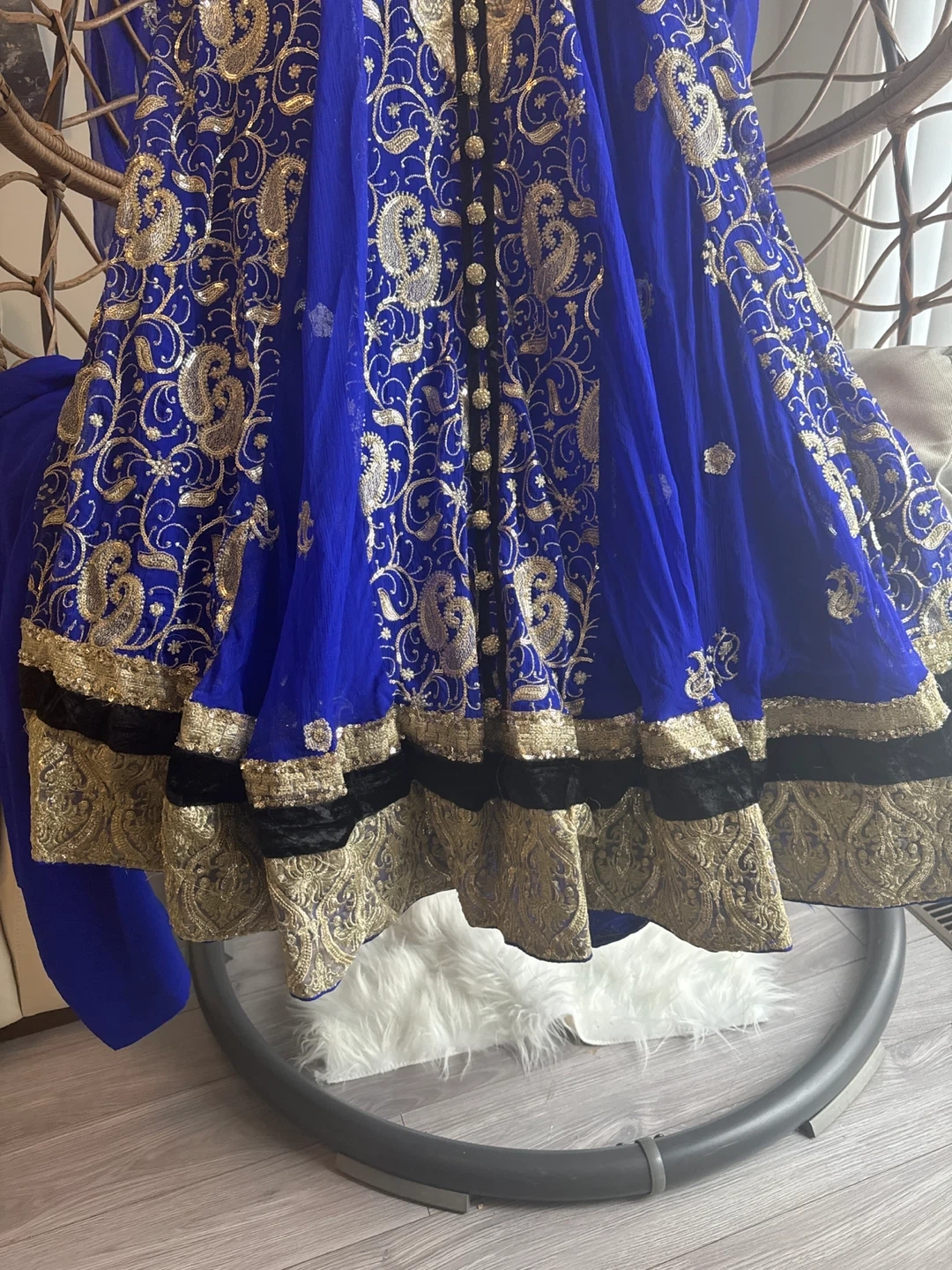 Beautiful blue Anarkali dress with intricate gold embroidery. The dress features a V-neckline and button-down detailing. Perfect for special occasions!