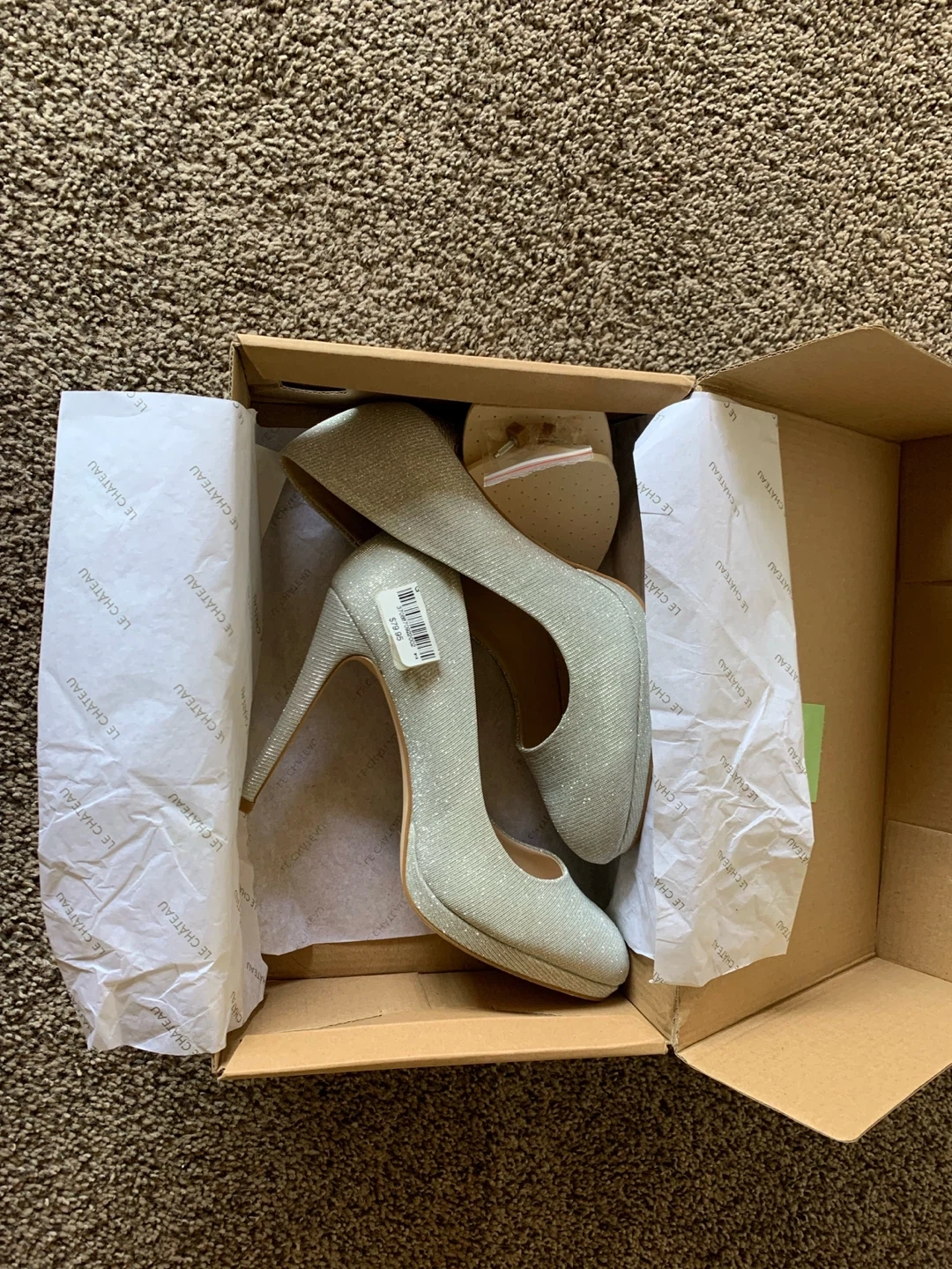 These Le Chateau heels are in great condition and come in their original box! They're a beautiful silver colour and are a size 10 (40). Originally bought for $79.95