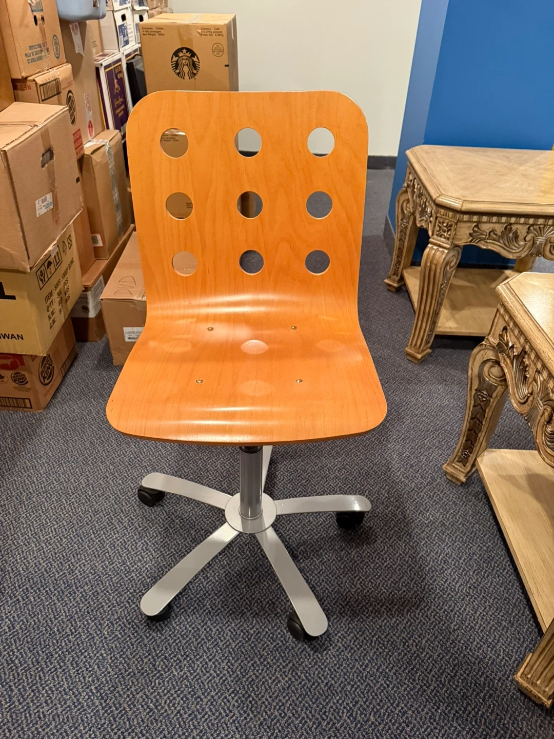 Selling 2 barely used office chairs. One is yellow and the other is black and has a unique design with holes in the backrest. Great for a home office or student desk