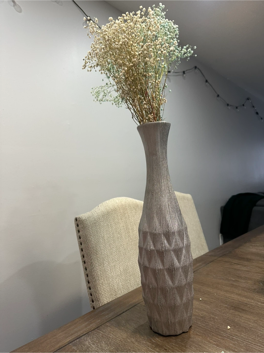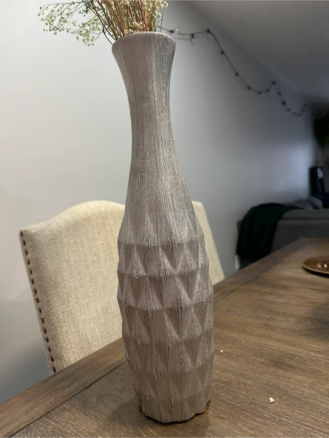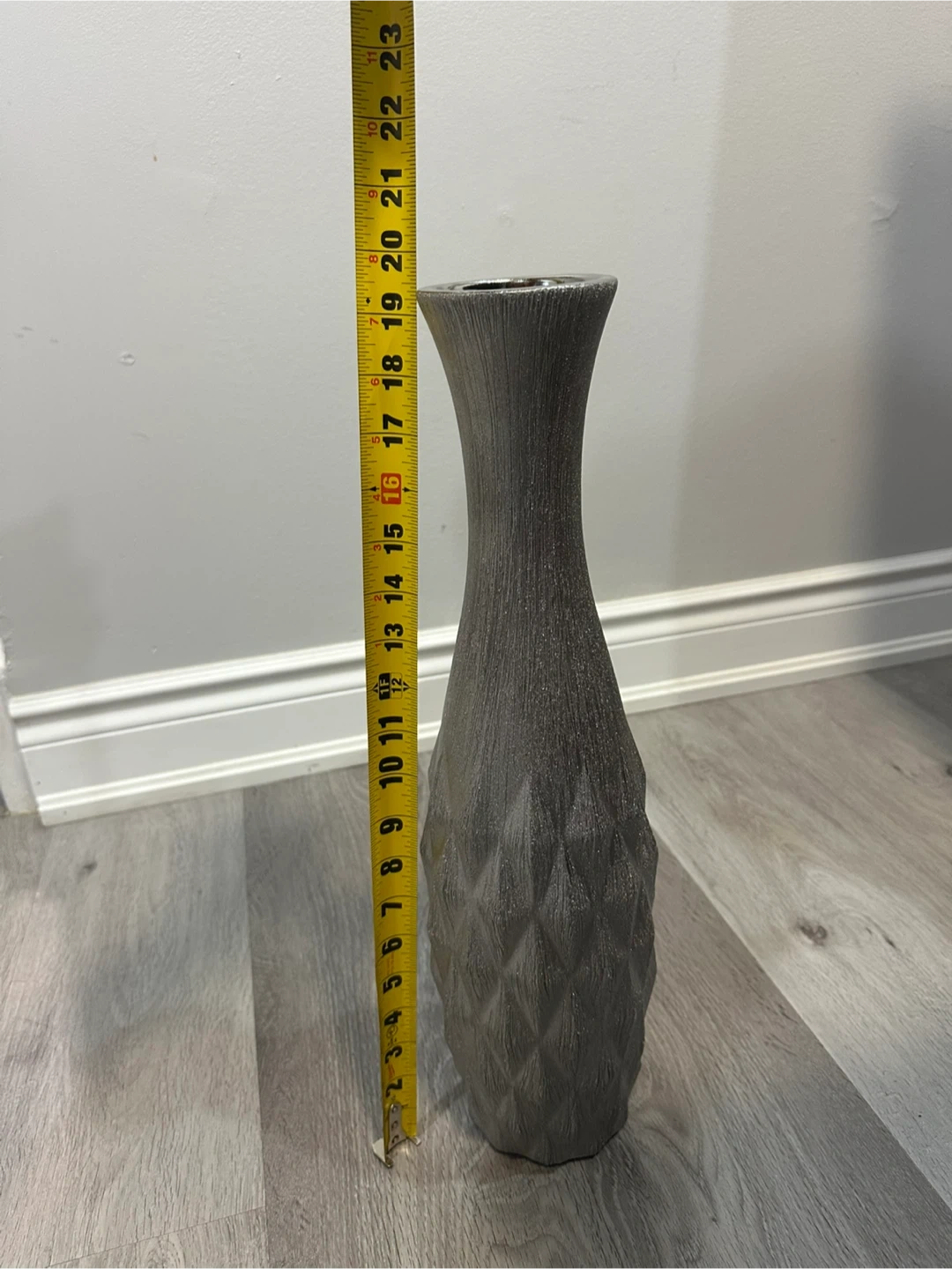Selling a decorative silver vase. It measures approximately 19.5 inches tall. It would look great with your favourite flowers! Originally about $45