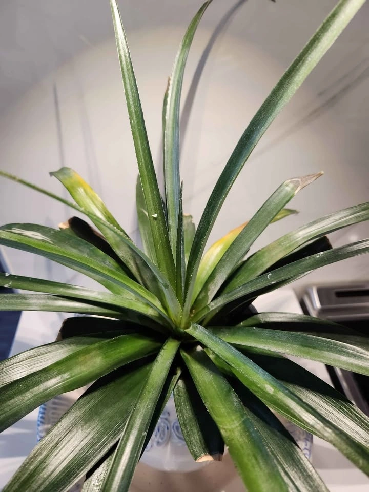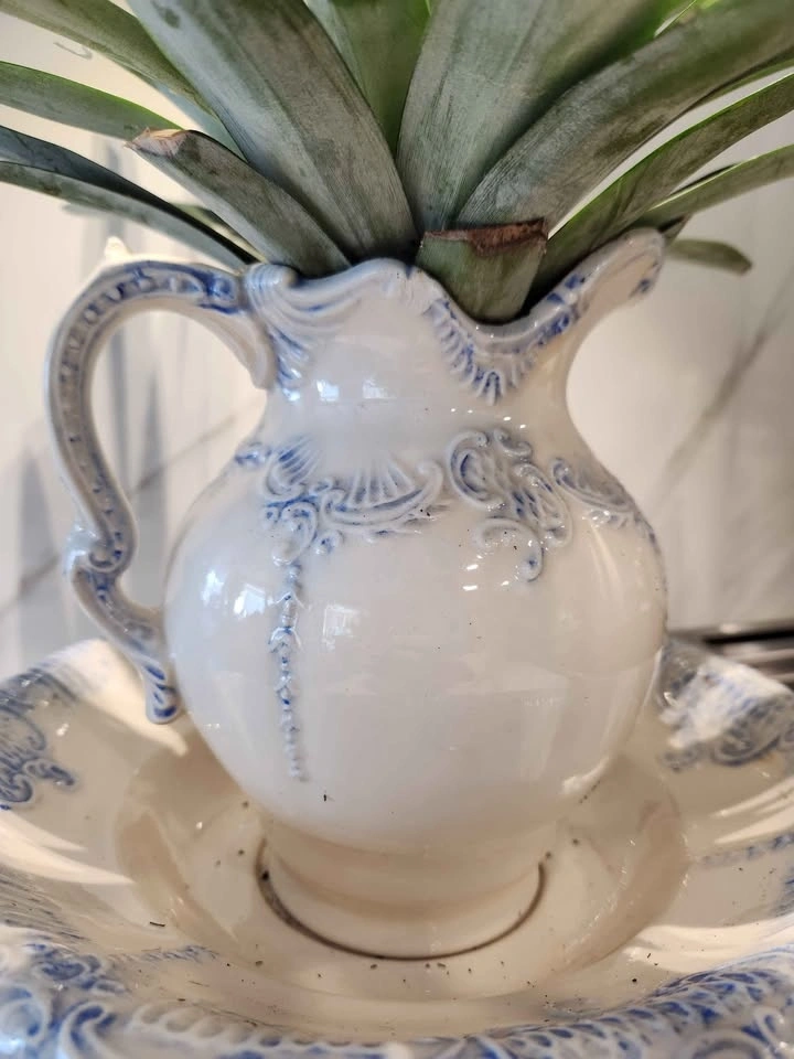 Bromeliad (likely Pineapple Plant). A sculptural, tropical beauty with firm, architectural leaves that make a real statement. Grown mainly for its look — fruiting is rare indoors, but the vibe is strong. Quick Care (easy + low fuss): Bright light, some direct sun is great. Water when top inch of soil is dry (doesn’t like soggy feet). Tough, resilient, and forgiving. Non-toxic to cats & dogs. Leaves are hard and pointy, so best kept out of reach of curious nibblers. White ceramic planter with soft blue detailing and matching saucer — classic, cottagey, and one-of-a-kind. Looks gorgeous on a windowsill or counter. A little tropical drama with vintage charm 🌴💙