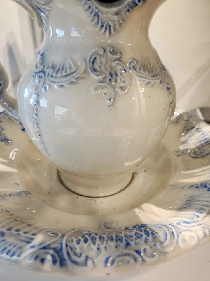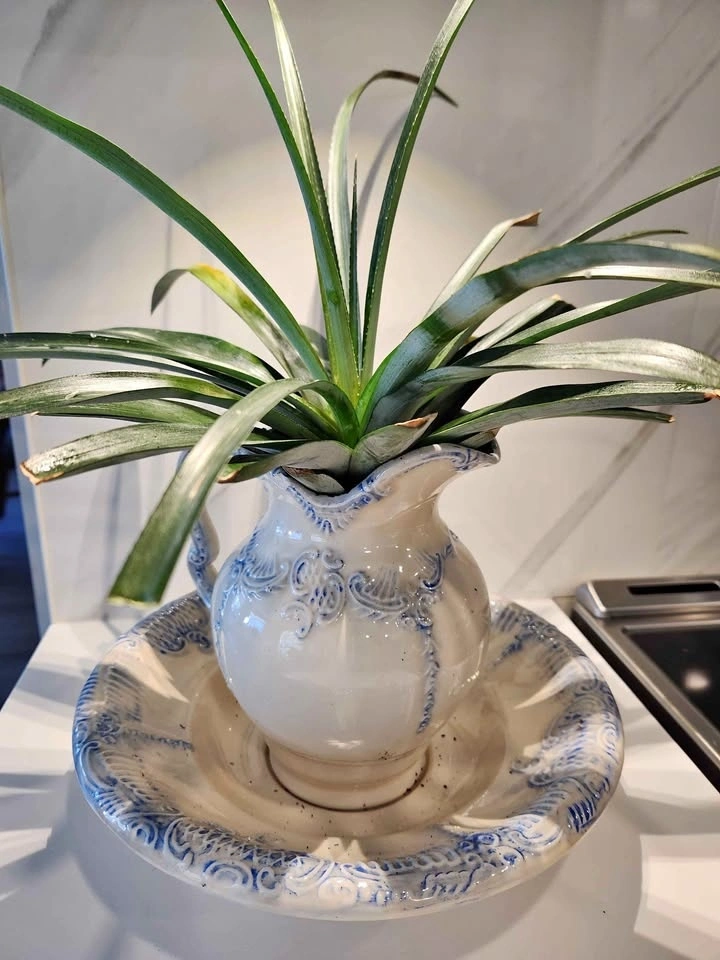 Bromeliad (likely Pineapple Plant). A sculptural, tropical beauty with firm, architectural leaves that make a real statement. Grown mainly for its look — fruiting is rare indoors, but the vibe is strong. Quick Care (easy + low fuss): Bright light, some direct sun is great. Water when top inch of soil is dry (doesn’t like soggy feet). Tough, resilient, and forgiving. Non-toxic to cats & dogs. Leaves are hard and pointy, so best kept out of reach of curious nibblers. White ceramic planter with soft blue detailing and matching saucer — classic, cottagey, and one-of-a-kind. Looks gorgeous on a windowsill or counter. A little tropical drama with vintage charm 🌴💙